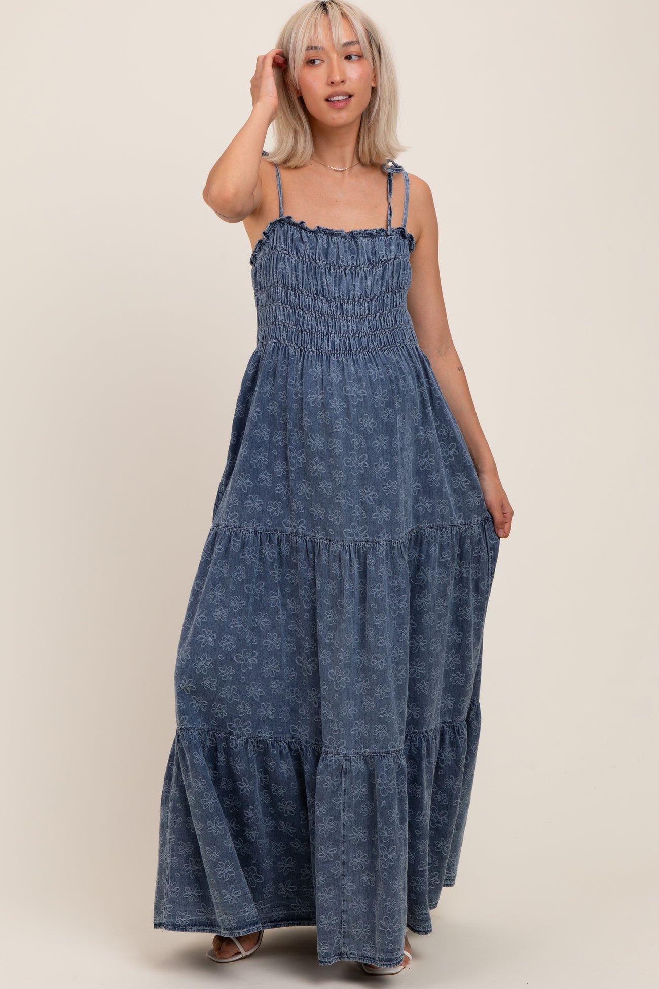 Navy Floral Denim Smocked Tiered Maternity Maxi Dress