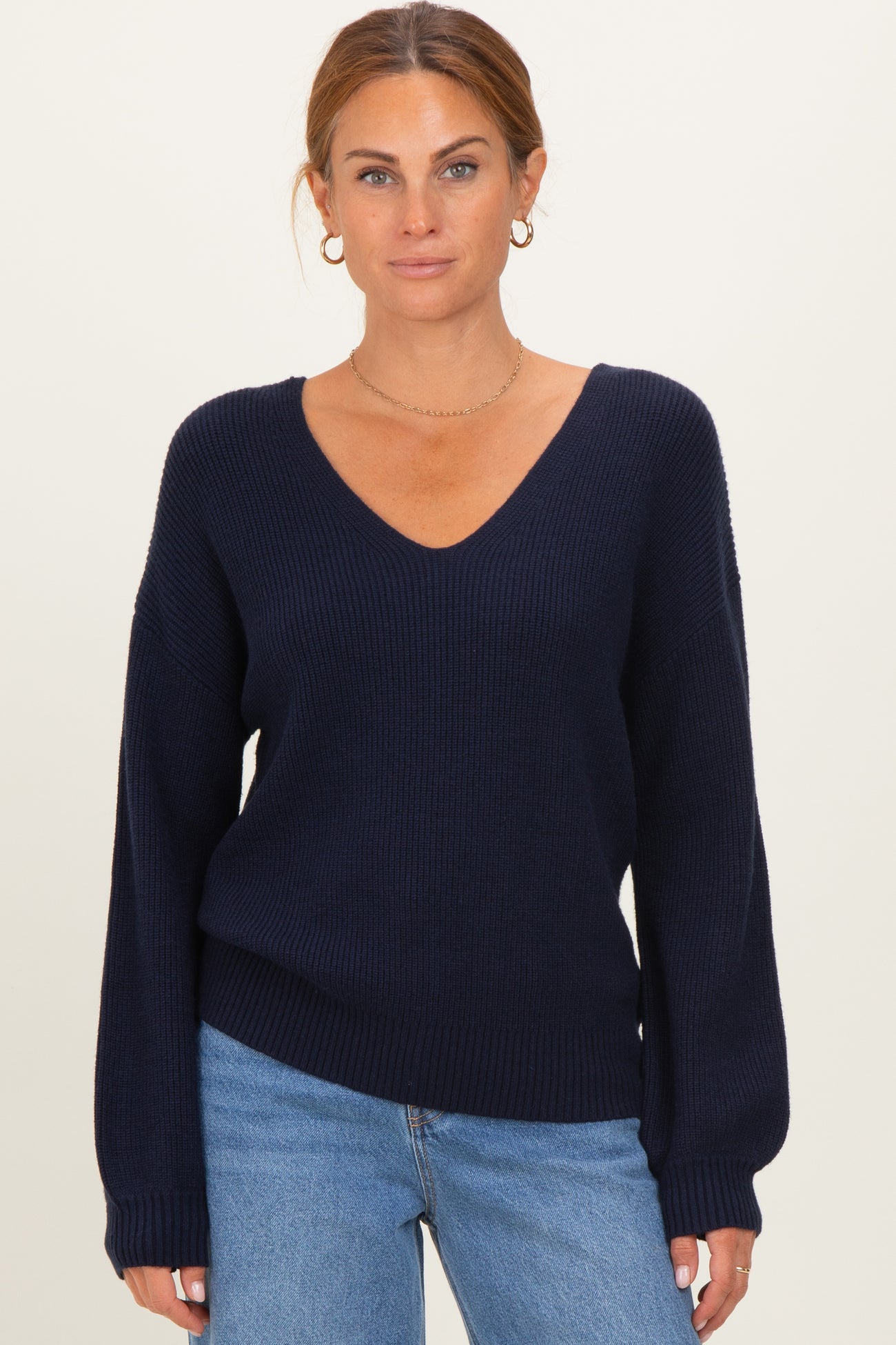 Navy V-Neck Drop Shoulder Back Bow Tie Detail Sweater