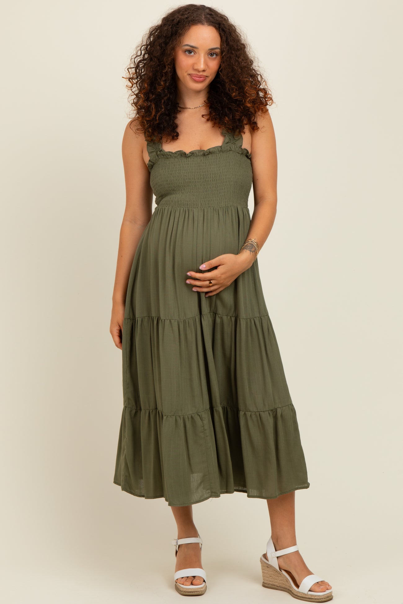 Olive Smocked Ruffle Strap Tiered Maternity Midi Dress