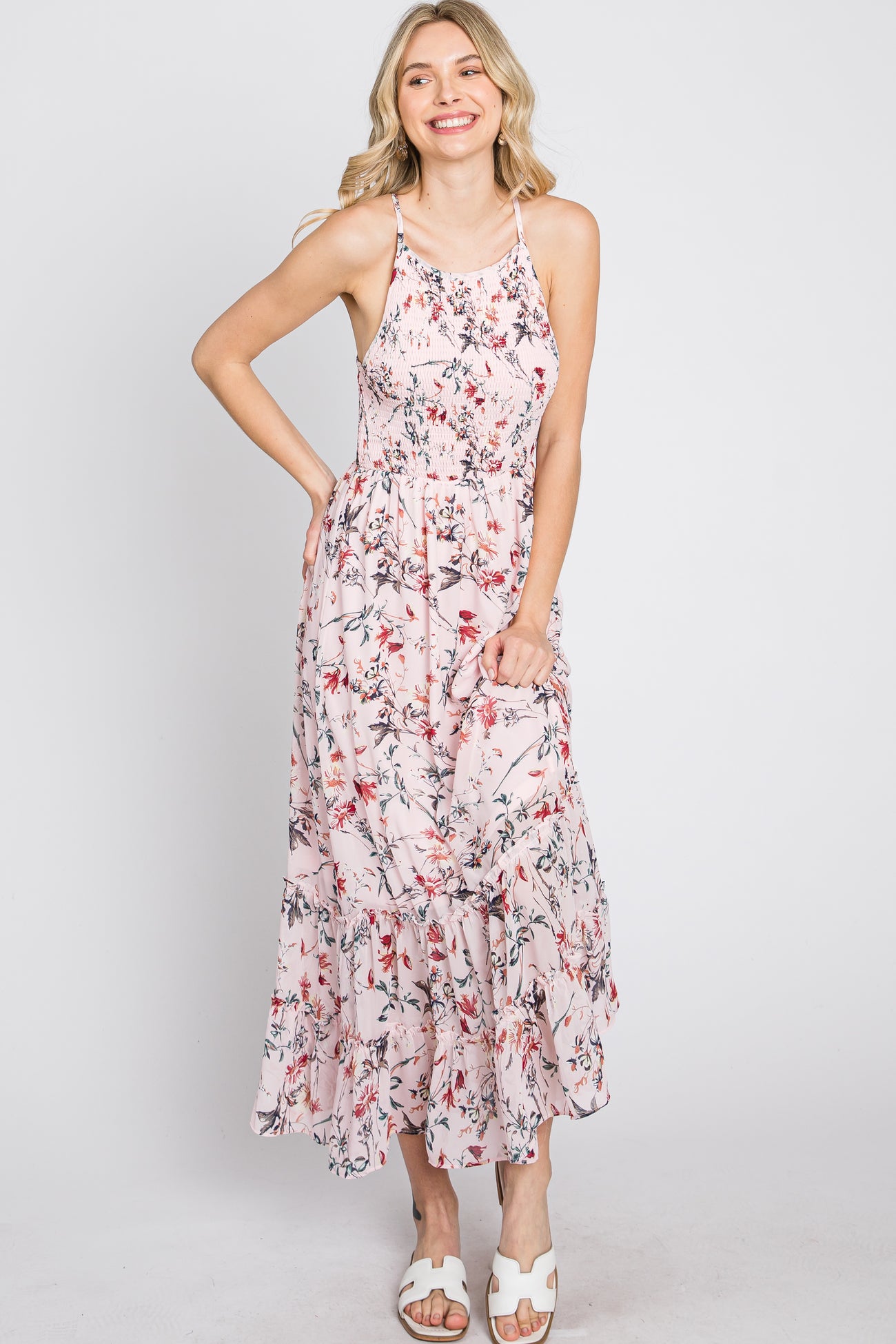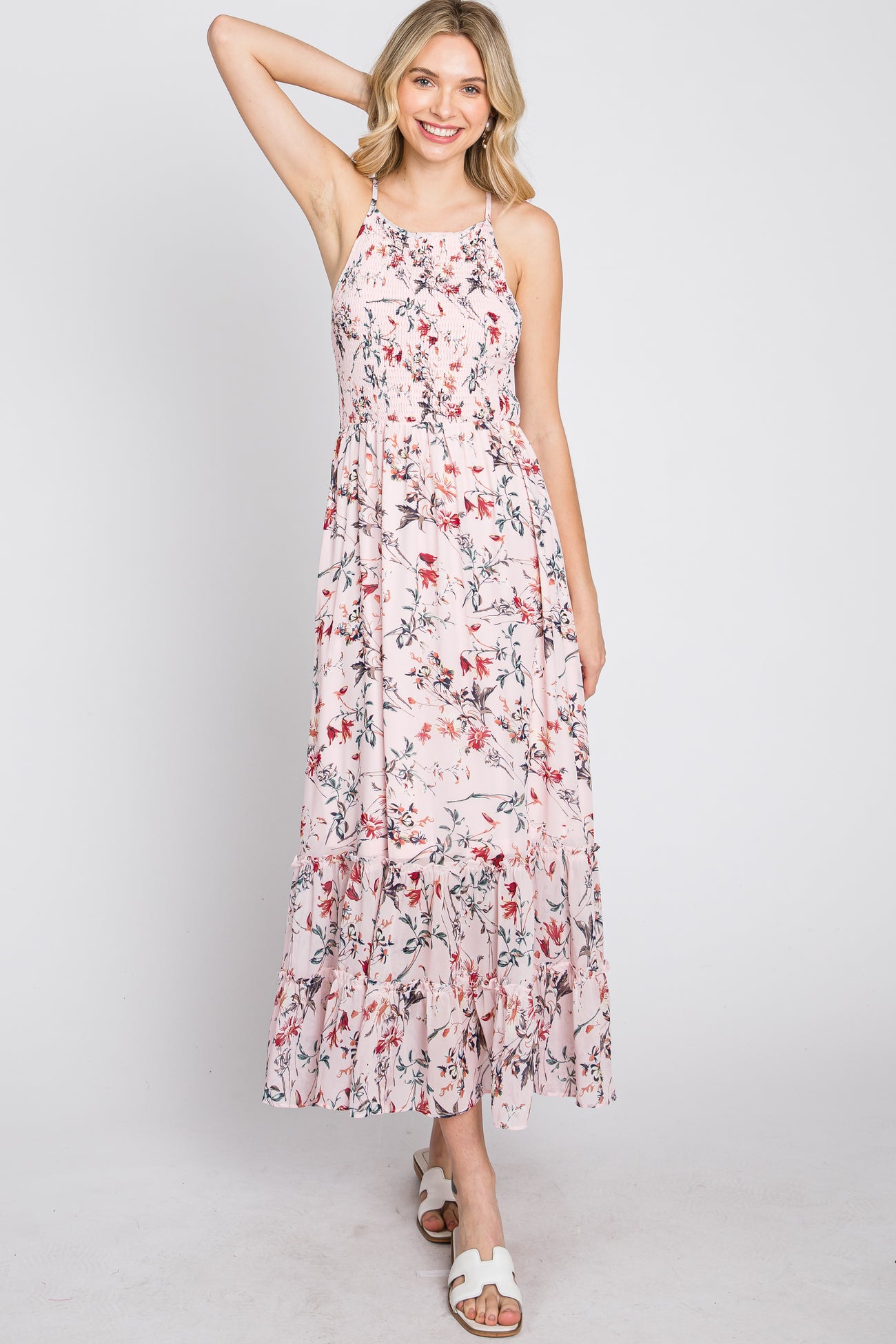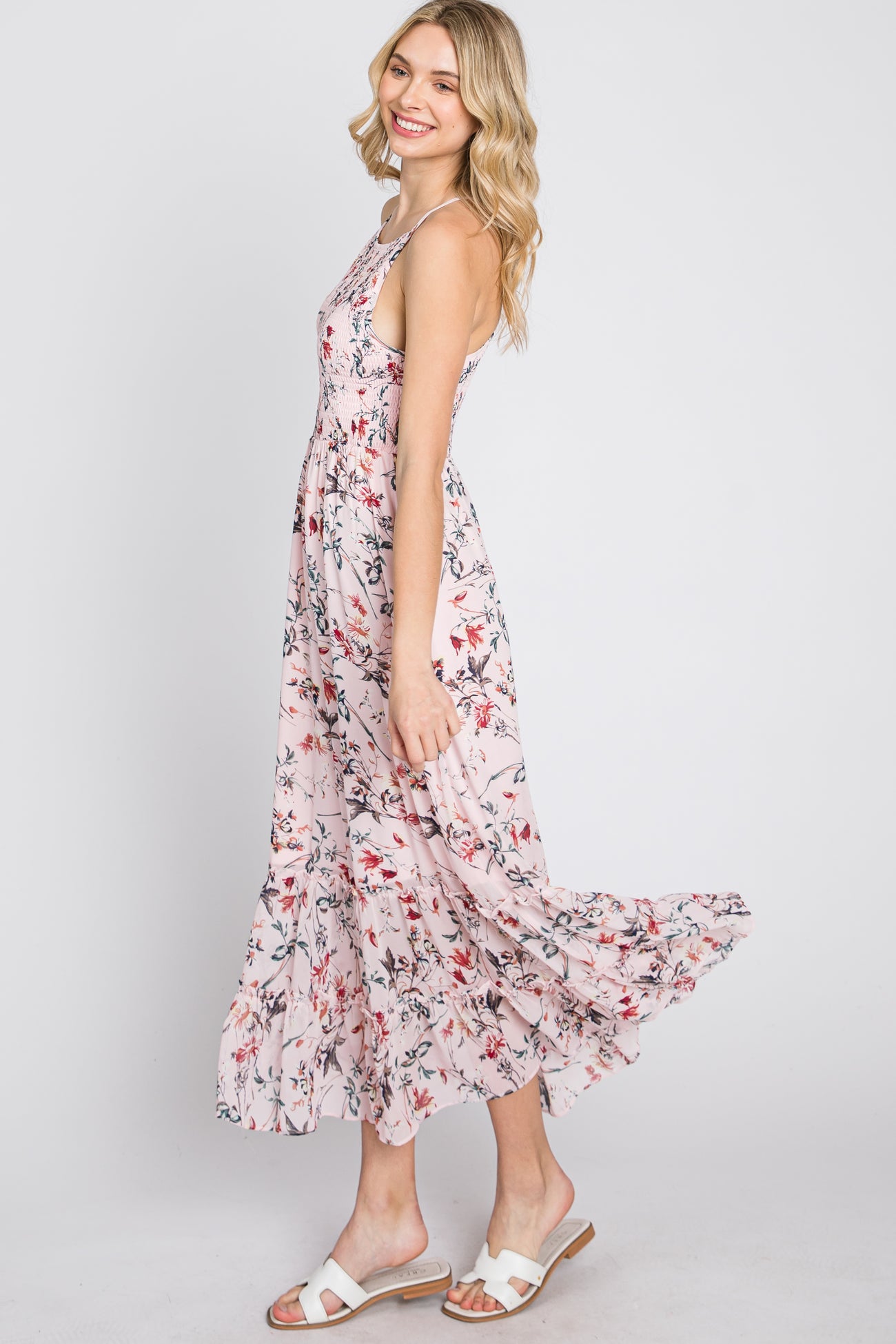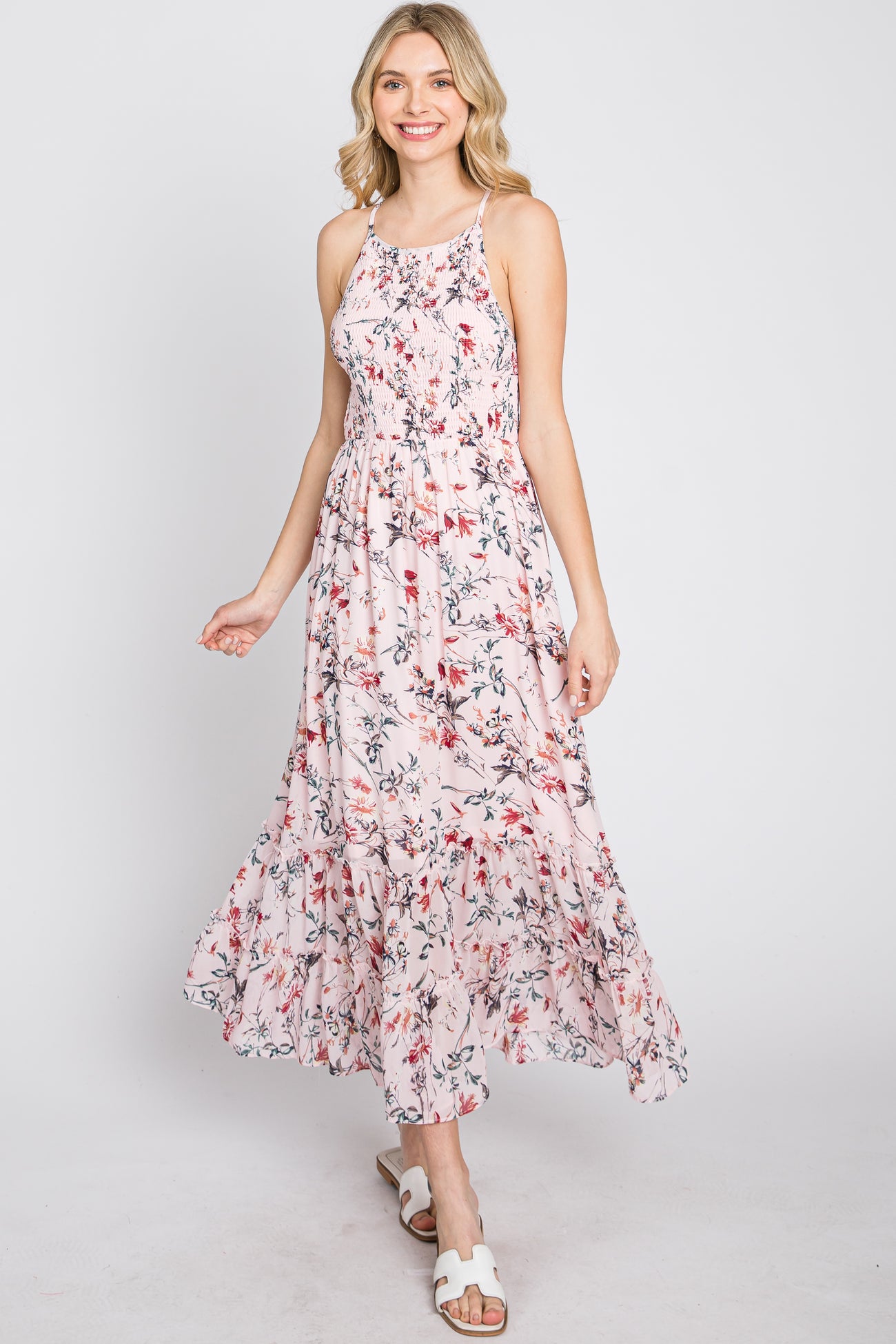 Details A floral chiffon print midi dress featuring a smocked elastic top, adjustable straps, a ruffle hem and double lined. Content + Care