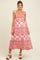 Embrace effortless style and comfort in this Red Embroidered Smocked Cutout Maternity Midi Dress. Featuring intricate red embroidery on a white base, this dress adds a touch of boho-chic elegance to your maternity wardrobe. The smocked bodice provides gentle stretch and support, perfectly accommodating your growing bump. Delicate ruffled straps and a flattering midi length with scalloped hem create a feminine silhouette that’s ideal for any occasion. Lightweight and breathable, this dress keeps you cool and comfortable from day to night. Elevate your maternity look with this standout piece designed for both style and ease.