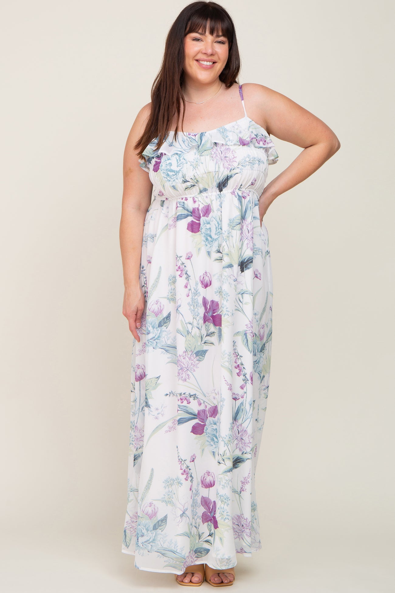 White Floral Sleeveless Ruffle Plus Maxi Dress