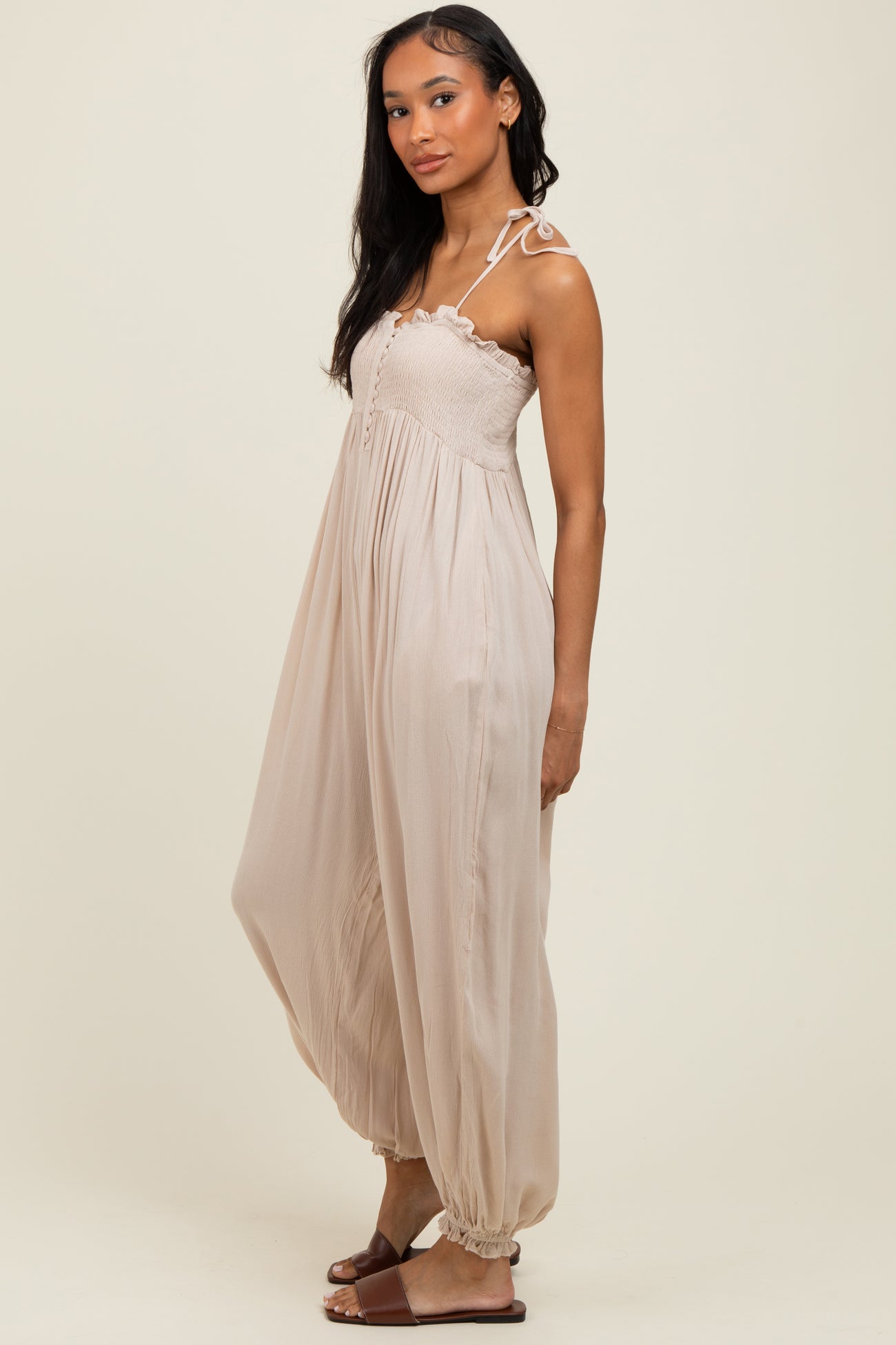 Beige Smocked Button Front Shoulder Tie Jumpsuit