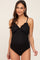 A ribbed maternity one piece swimsuit featuring a ruffle v-neckline, side ruching, adjustable straps and a self-tie cutout back. Removable padding.