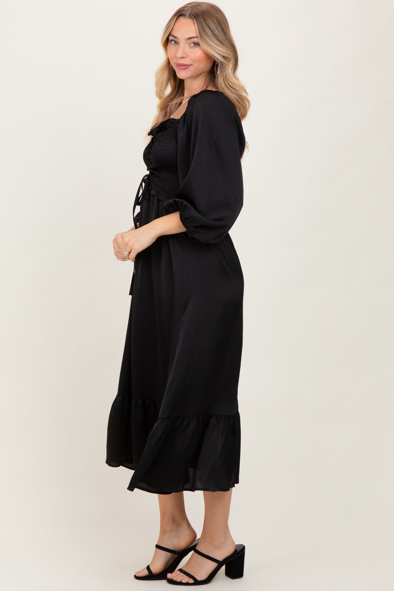 Elevate your wardrobe with this stunning Black Satin Smocked Cinched Bust Midi Dress. Featuring a flattering smocked bust with adjustable cinch detail, this dress beautifully accentuates your silhouette. The silky satin fabric offers a sleek, luxurious feel, while the midi length and ruffled hem add a touch of elegance. Designed with long puff sleeves and a square neckline, it strikes the perfect balance between chic and comfortable. Ideal for special occasions, date nights, or stylish evenings out. Pair with heels and delicate jewelry for a timeless, sophisticated look. Available in multiple sizes.