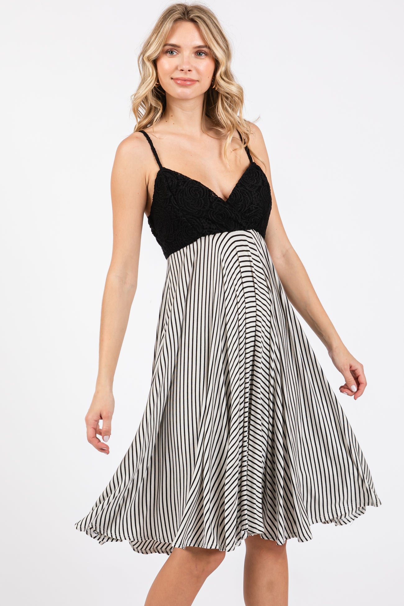 A dress featuring a v-neckline, lace knit bust, adjustable straps and a striped knit A-line skirt.