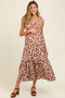 A two piece swimsuit featuring a v-neckline with ruffle trim, a back tie and a pair of high waist bottoms with ruched sides.