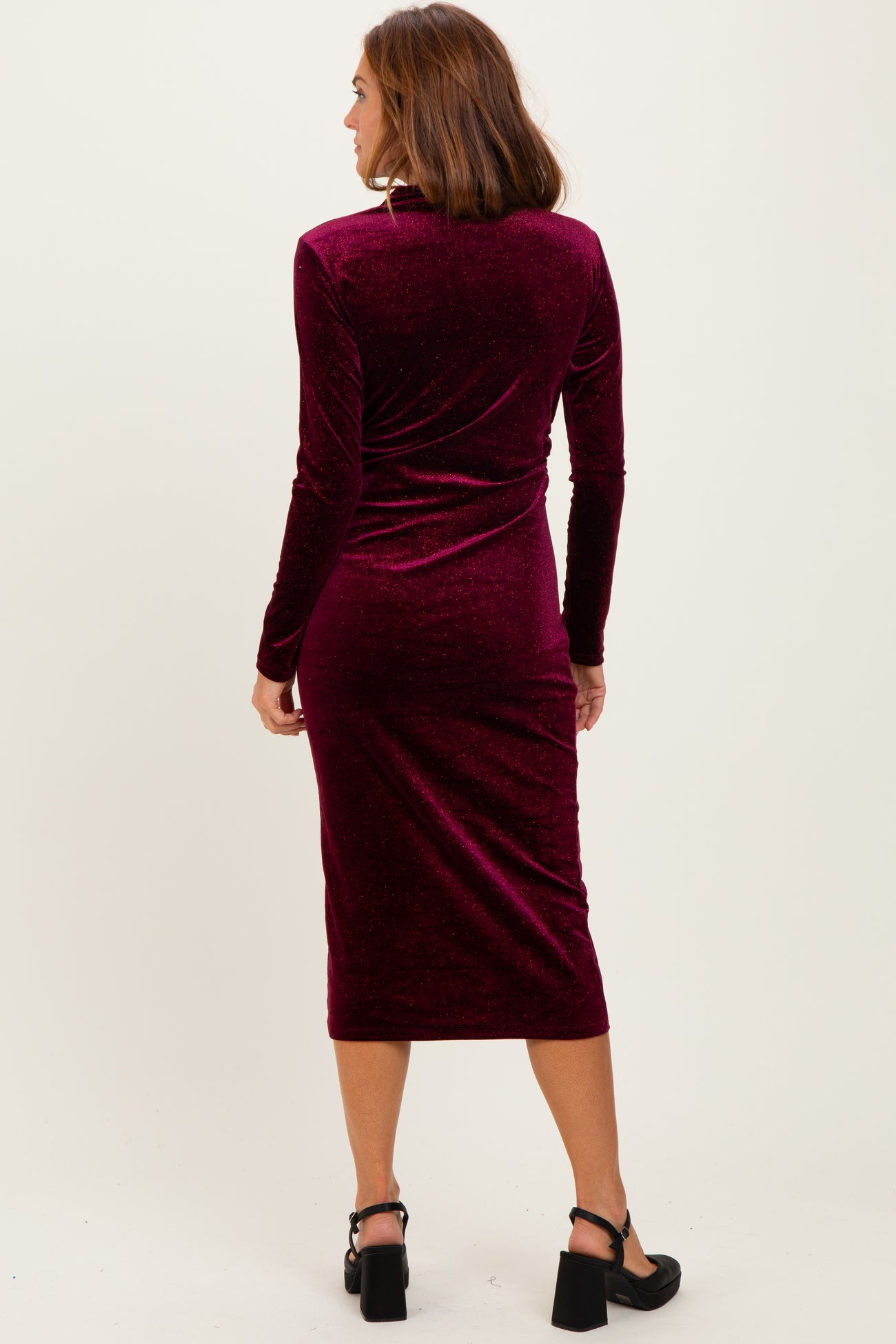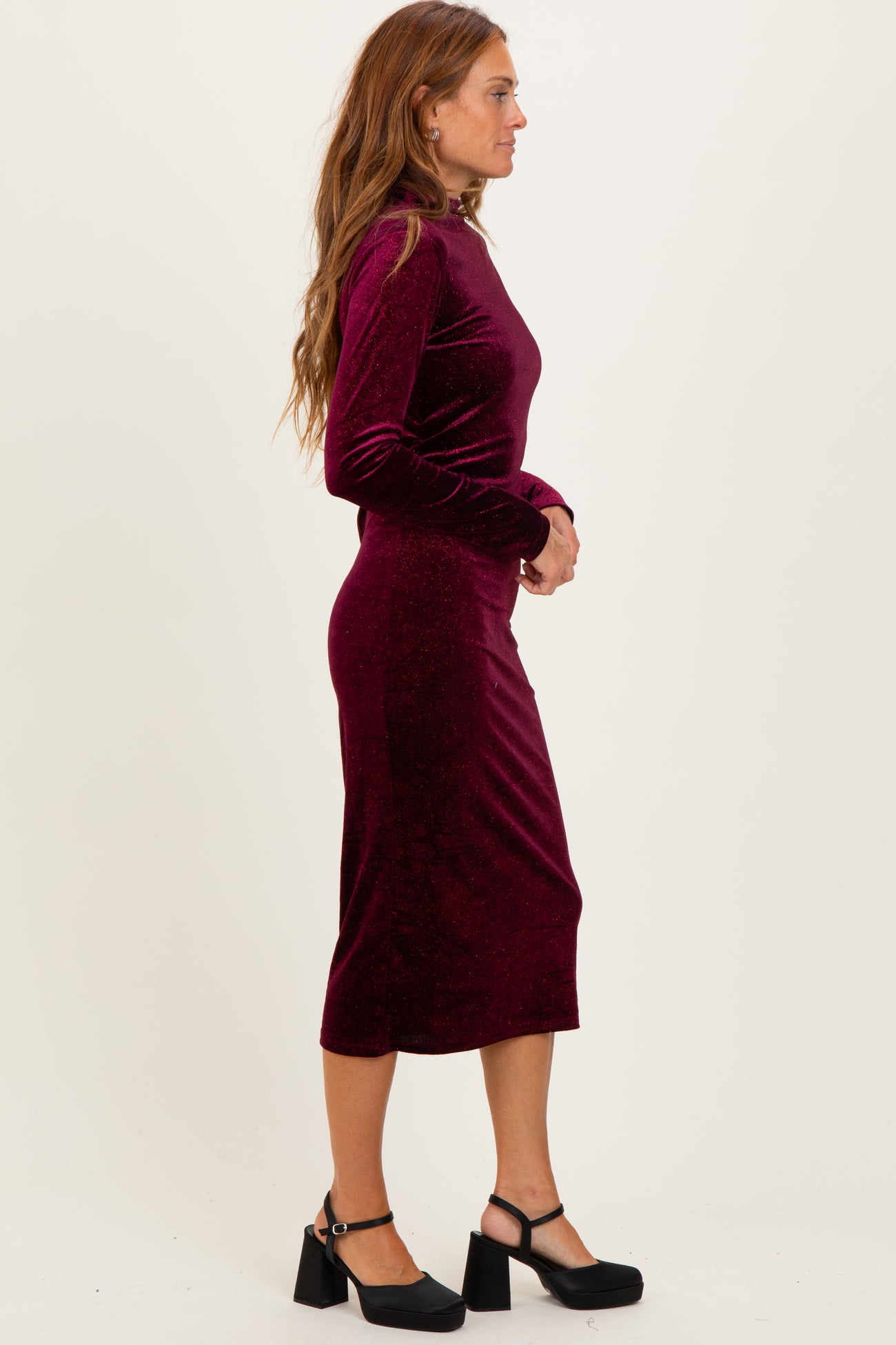 Step out in style with our Burgundy Glitter Velvet Ruched Midi Dress. Crafted from luxuriously soft velvet with a subtle glitter finish, this dress radiates elegance and sophistication. The rich burgundy hue pairs beautifully with the figure-flattering ruching along the sides, enhancing your silhouette. Featuring a classic high neckline and long sleeves, this midi-length dress is perfect for evening events and special occasions. Pair it with your favorite heels for a glamorous night out. Find your perfect fit and shine bright in this timeless wardrobe staple.