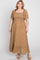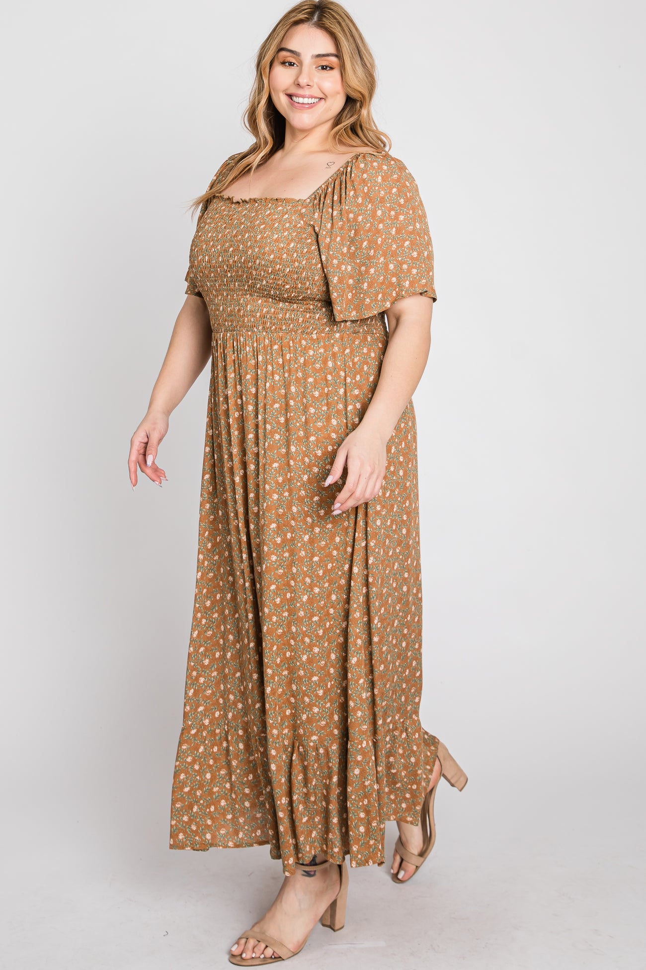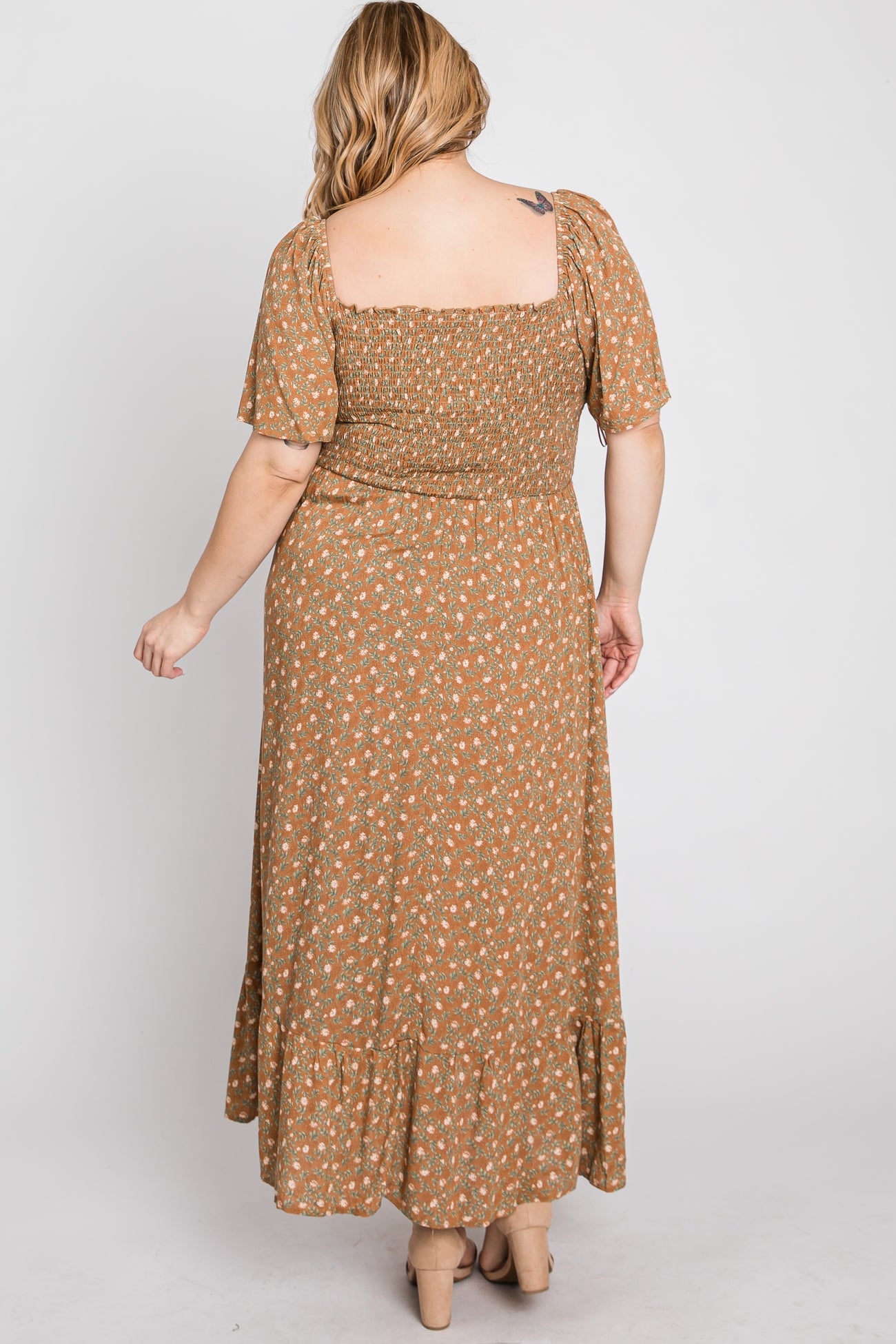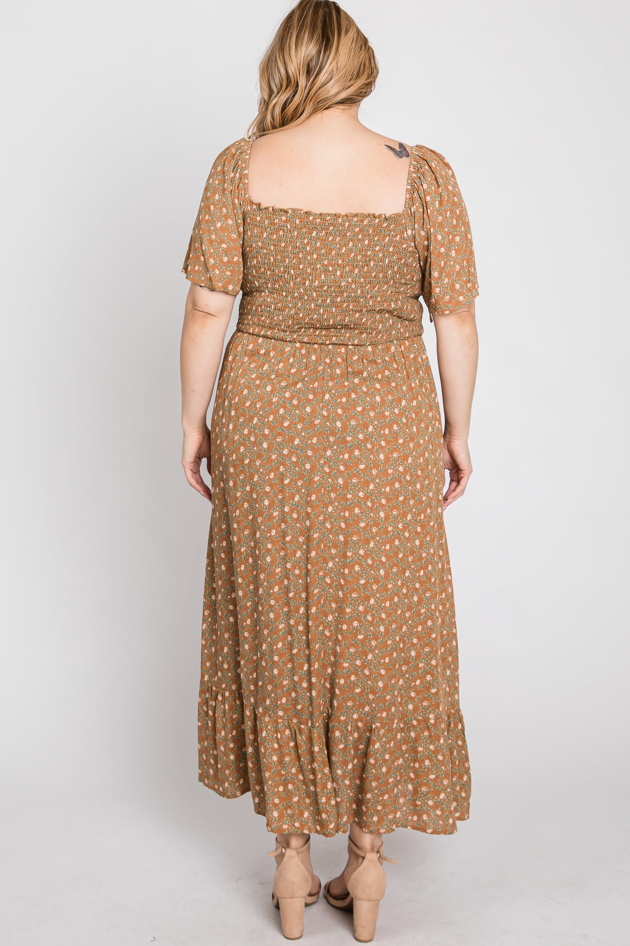 Camel Floral Smocked Square Neck Plus Midi Dress