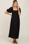 A gauze maternity midi dress featuring a collared neckline, 3/4 length puff sleeves, a button down front and an adjustable belted tie at the waist.