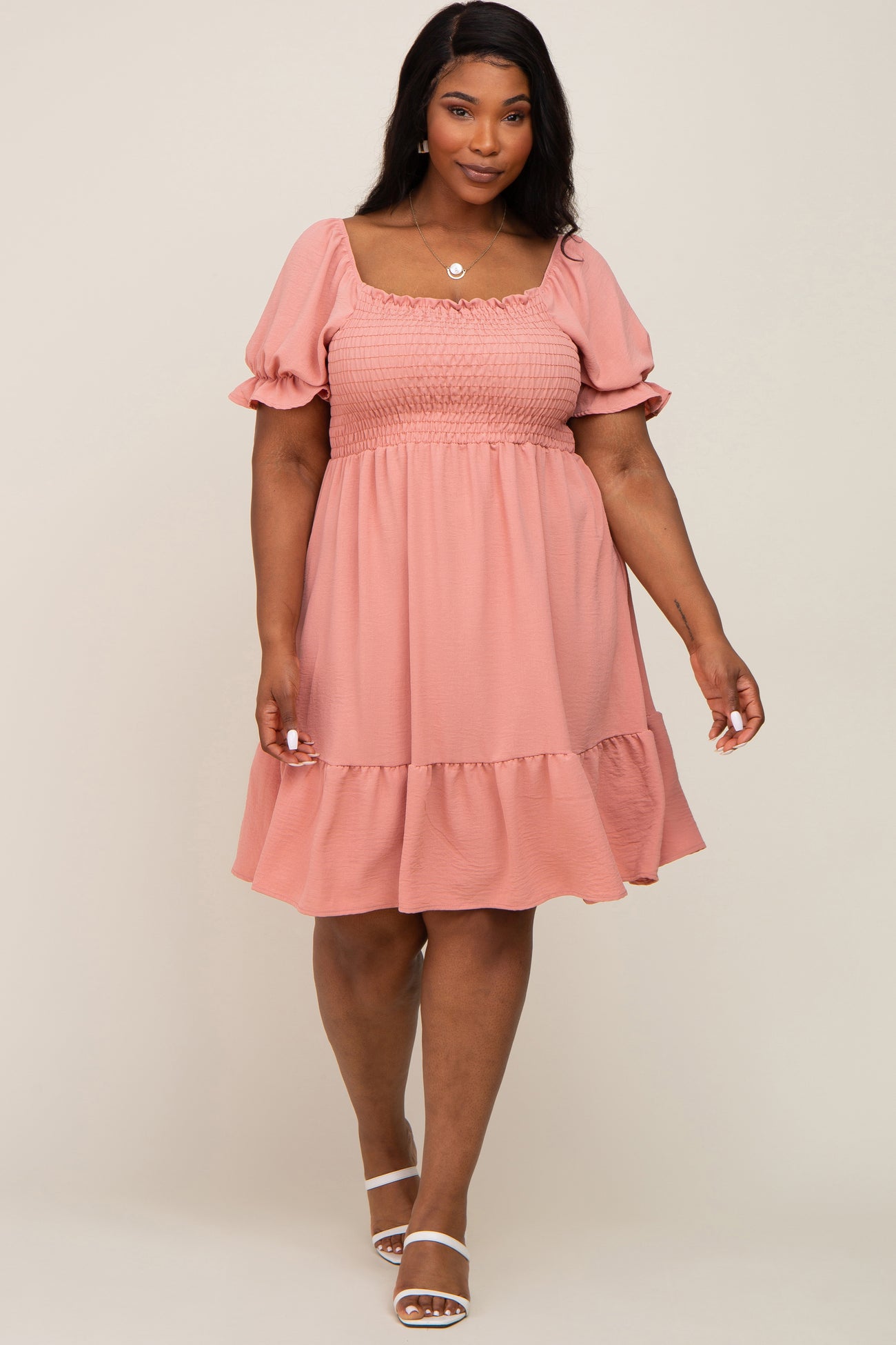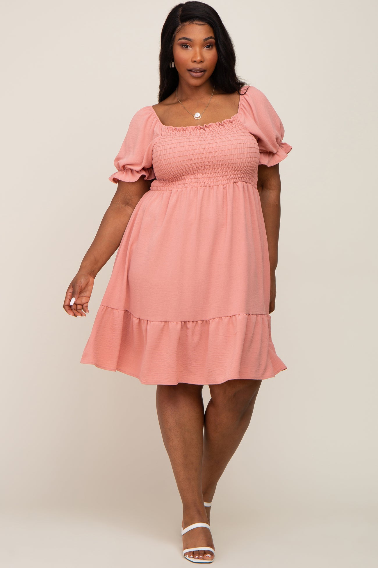 Coral Smocked Ruffle Trim Plus Dress