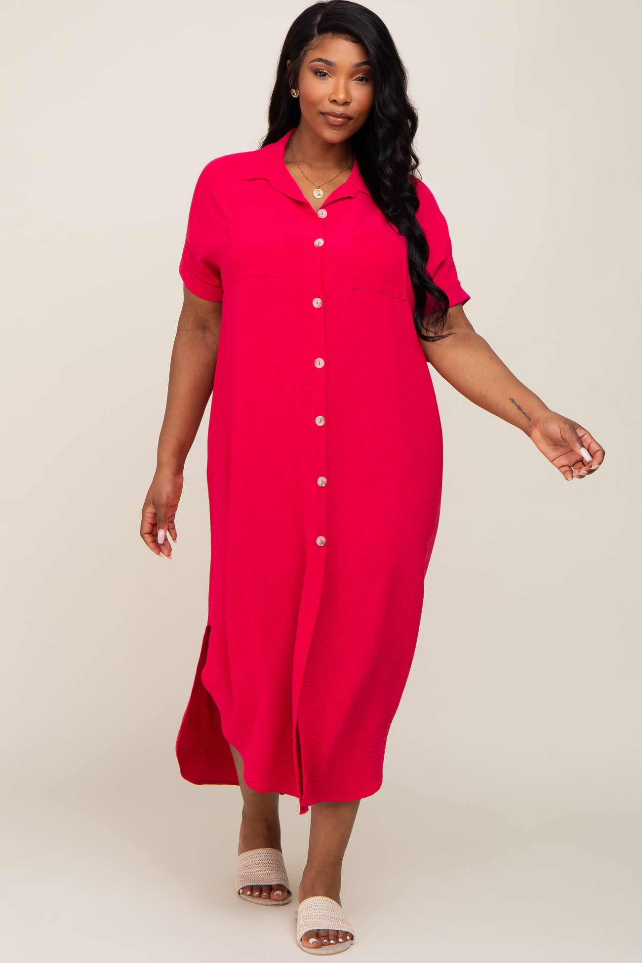 Fuchsia Button Down Hi Low Plus Maxi Dress