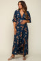 A solid hued maternity midi dress featuring a v-neckline with an adjustable front tie, a front cutout, short ruffle sleeves, a smocked elastic back, an empire waist and an A-line double lined skirt.
