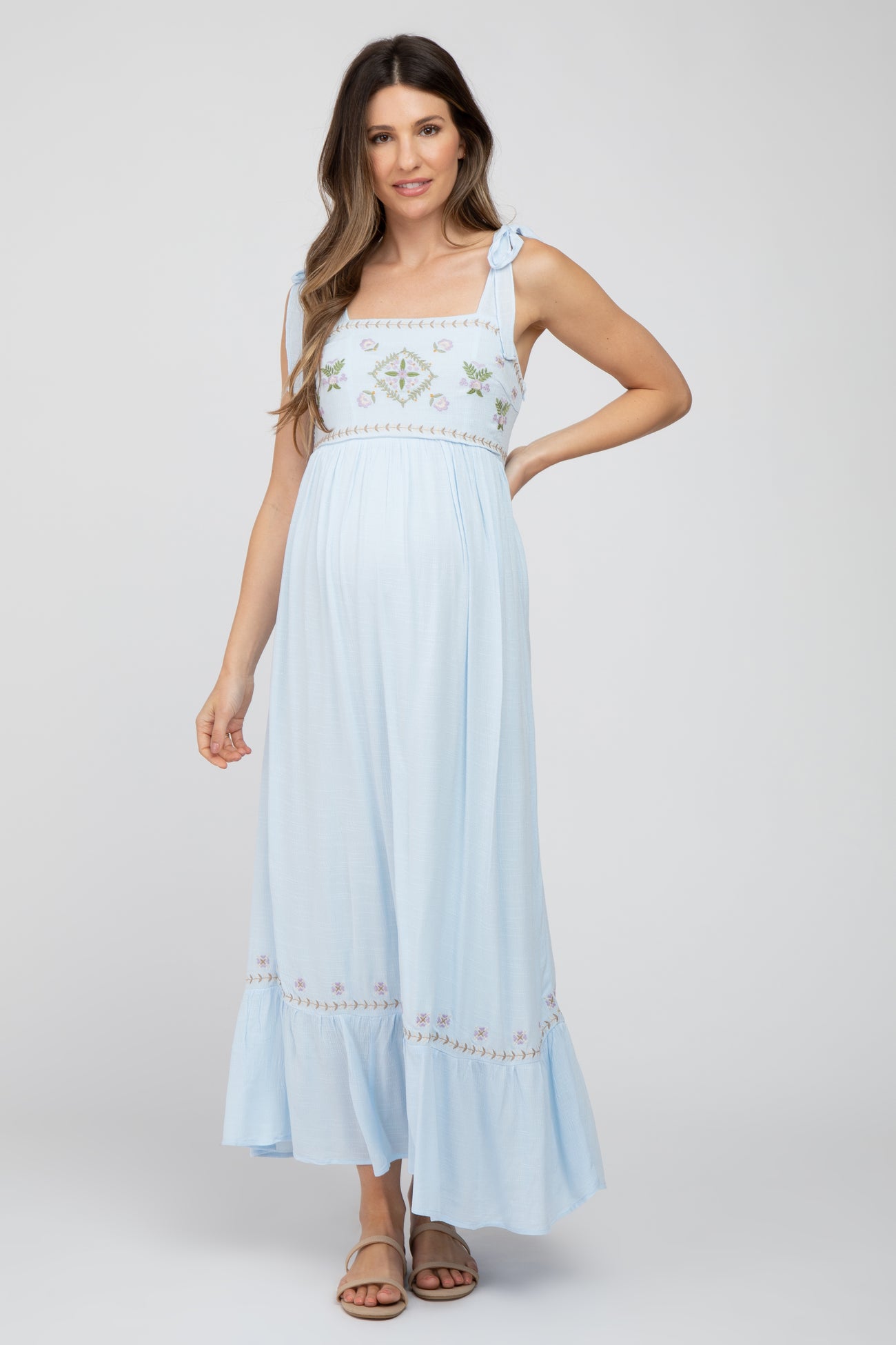 Details A sleeveless maternity maxi dress featuring floral embroidery, self-tie straps, a smocked back and a ruffle hem. Skirt is double lined. Content + Care