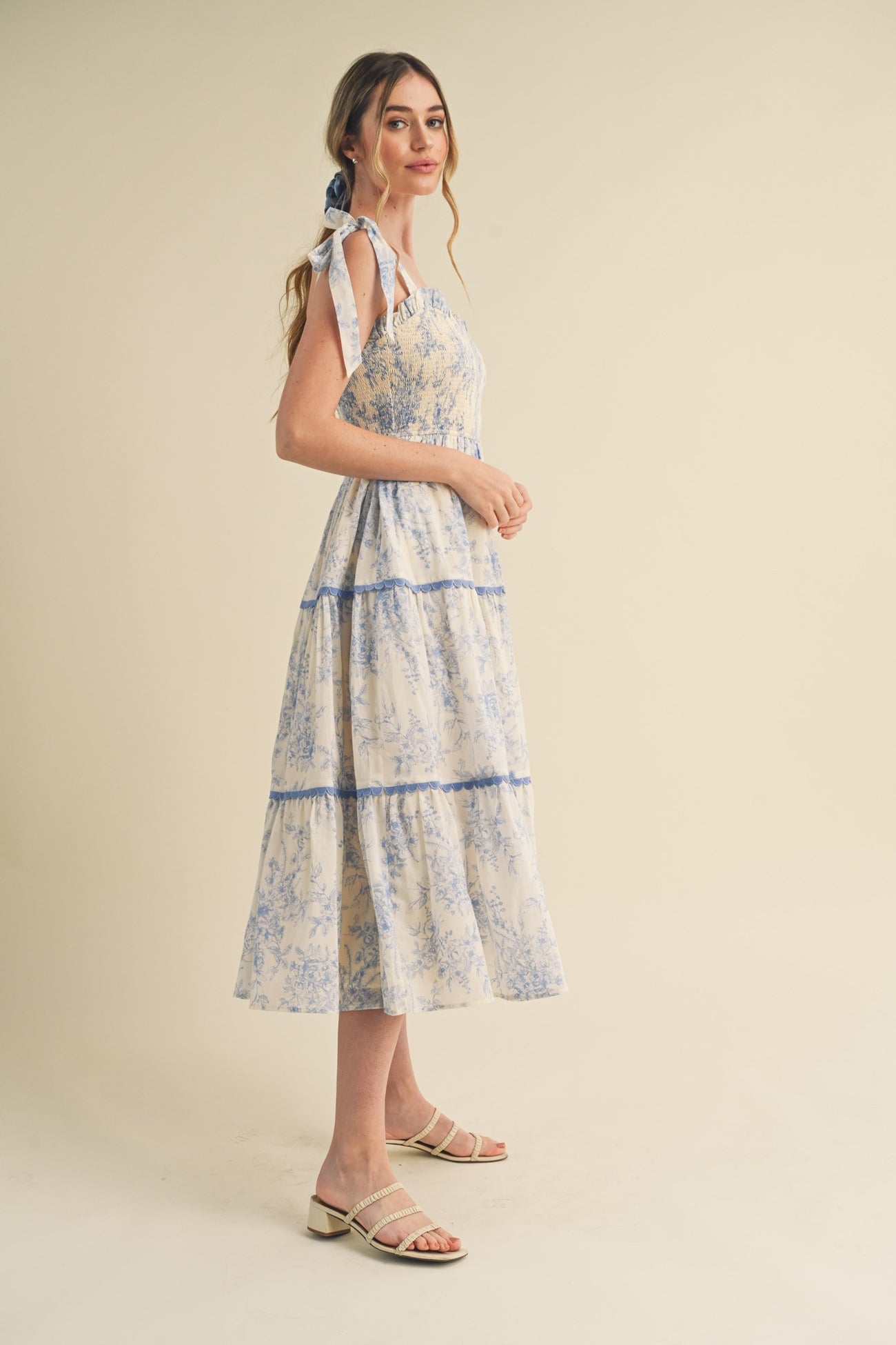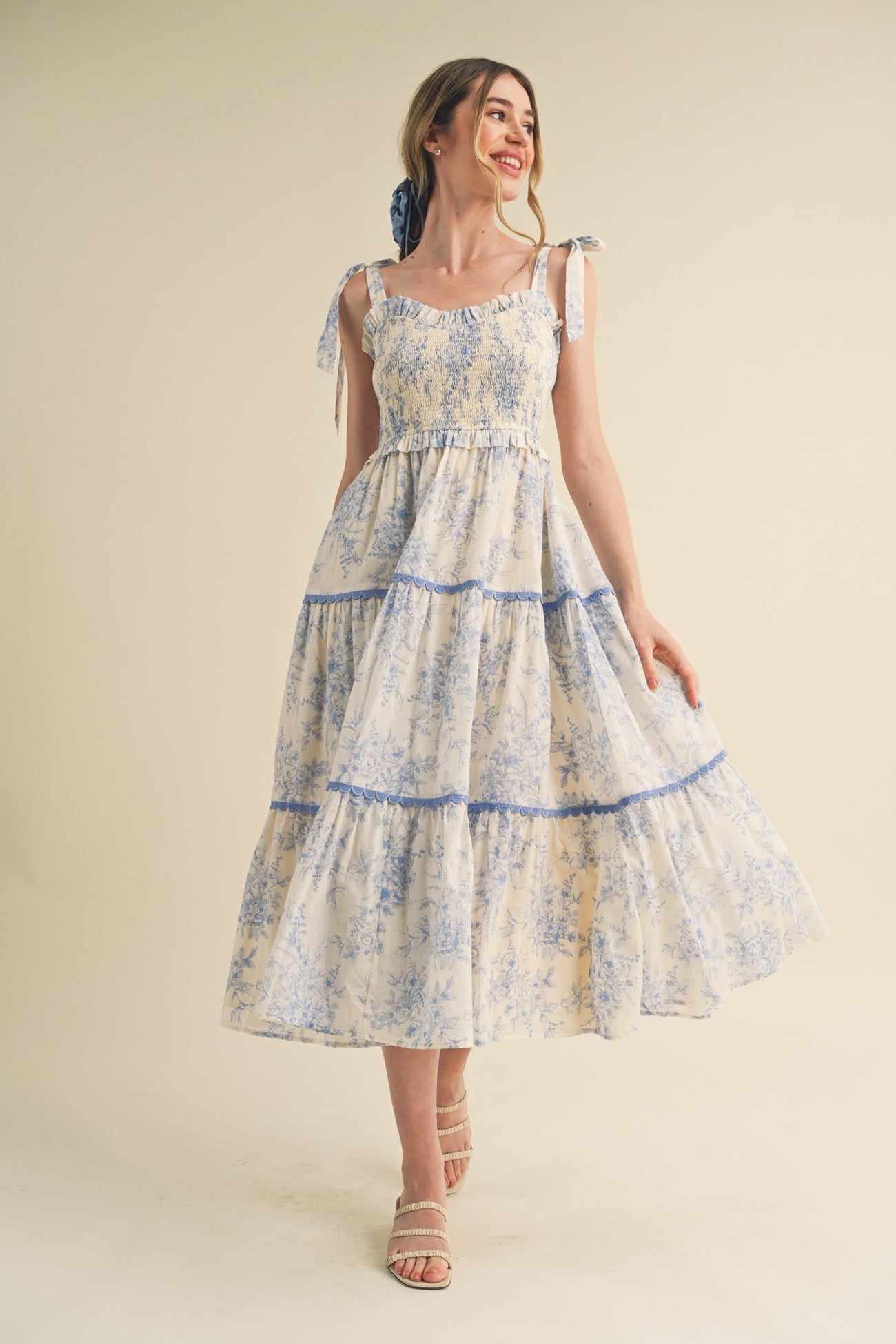 A floral sleeveless midi dress featuring knotted shoulder straps, a smocked top, side pockets, a tiered skirt and a square neckline.