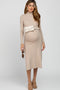 An ultra soft, brushed knit maternity/nursing fitted dress featuring a v-neckline with a wrap front and side tie detailing for easy access. Also features 3/4 length sleeves.