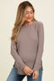 A solid long sleeve henley top with snap button closure on chest and raw hem details.