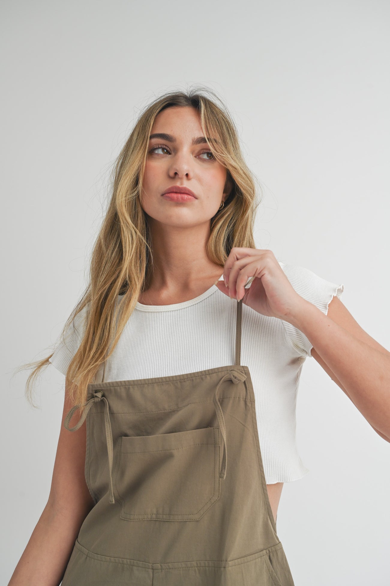 A solid hue short overall featuring adjustable strap ties, a front pocket, side pockets, and a cuffed hem.