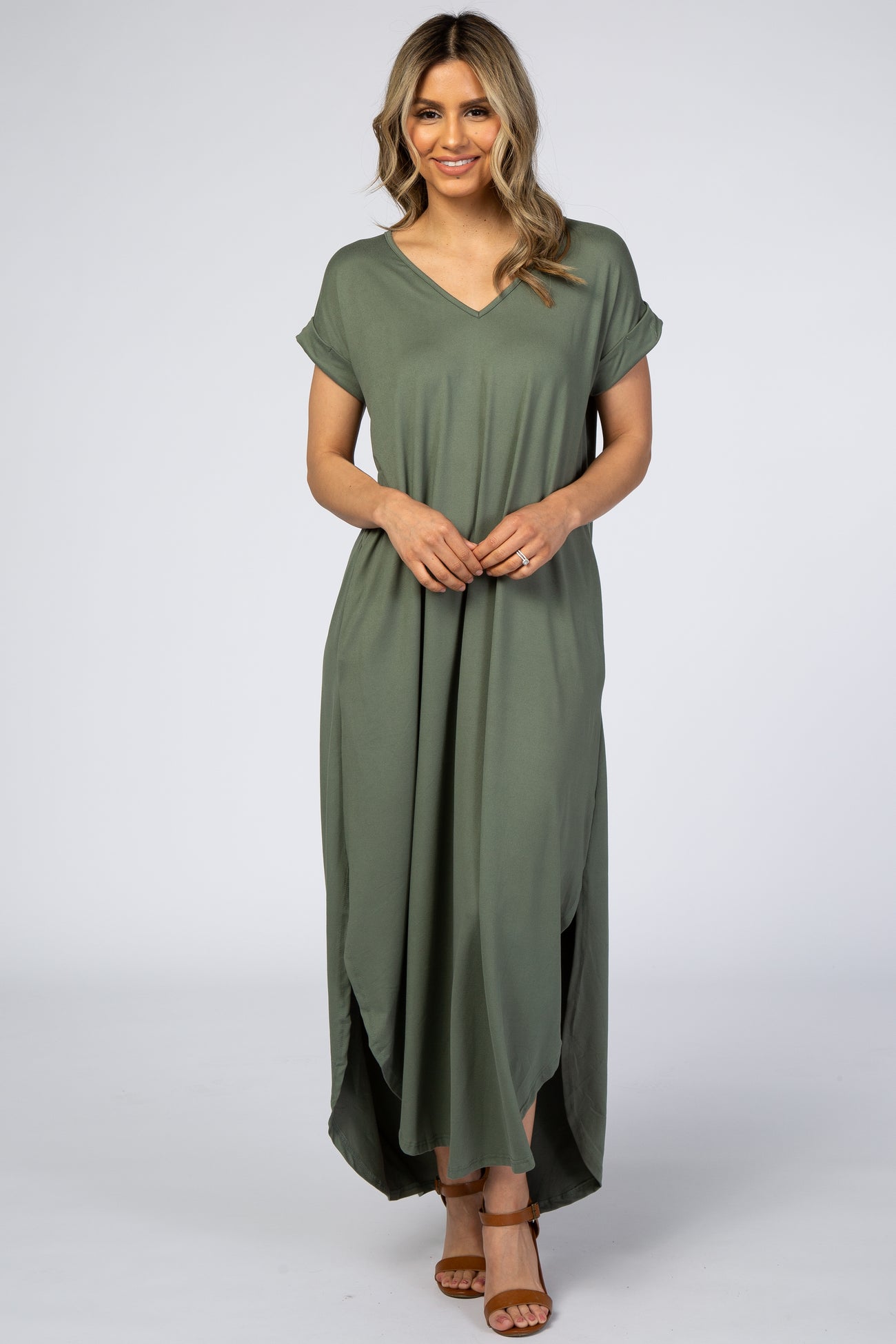 A solid hued maternity dress featuring short sleeves, a round neckline, side pockets, a curved hem and large side slits.