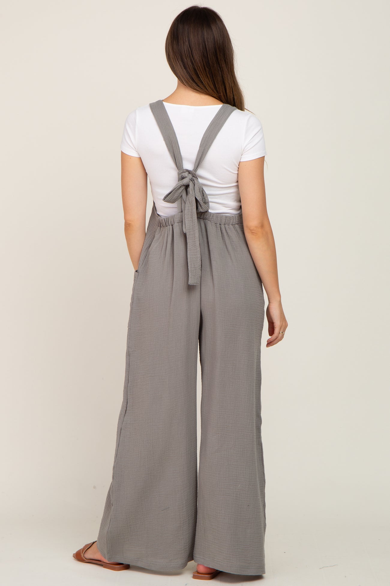 Details A solid maternity cotton overall with tie back detail and wide legs. Content + Care