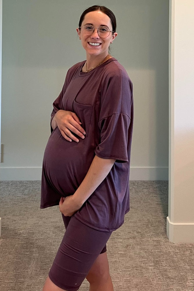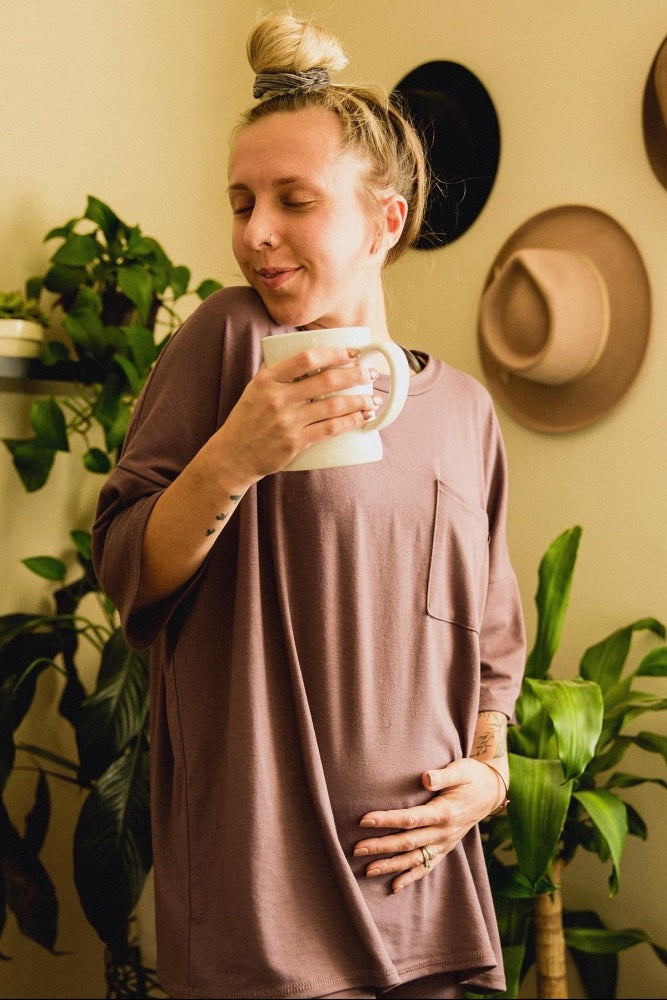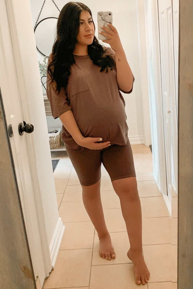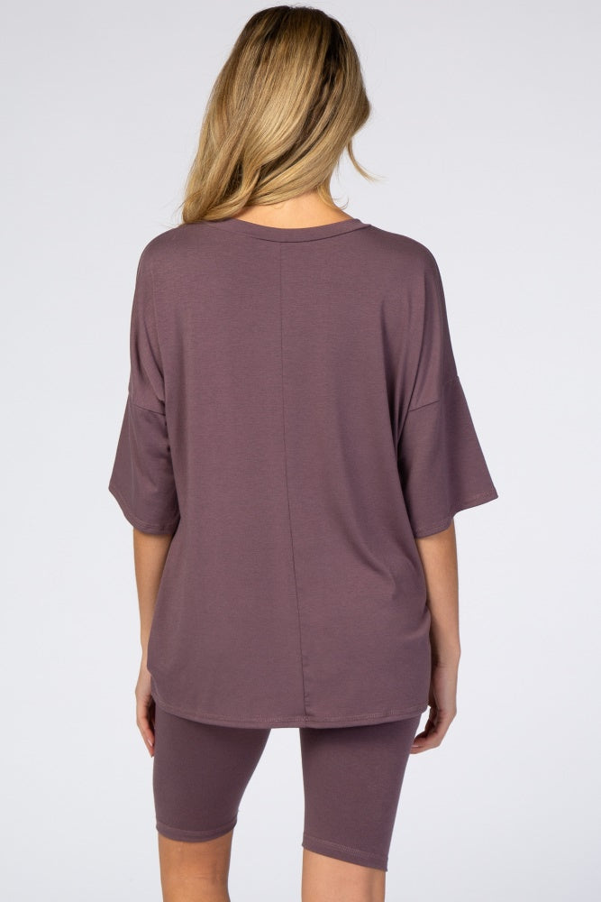 A sleep set featuring a dolman short sleeve top with a front pocket and a pair of biker shorts.