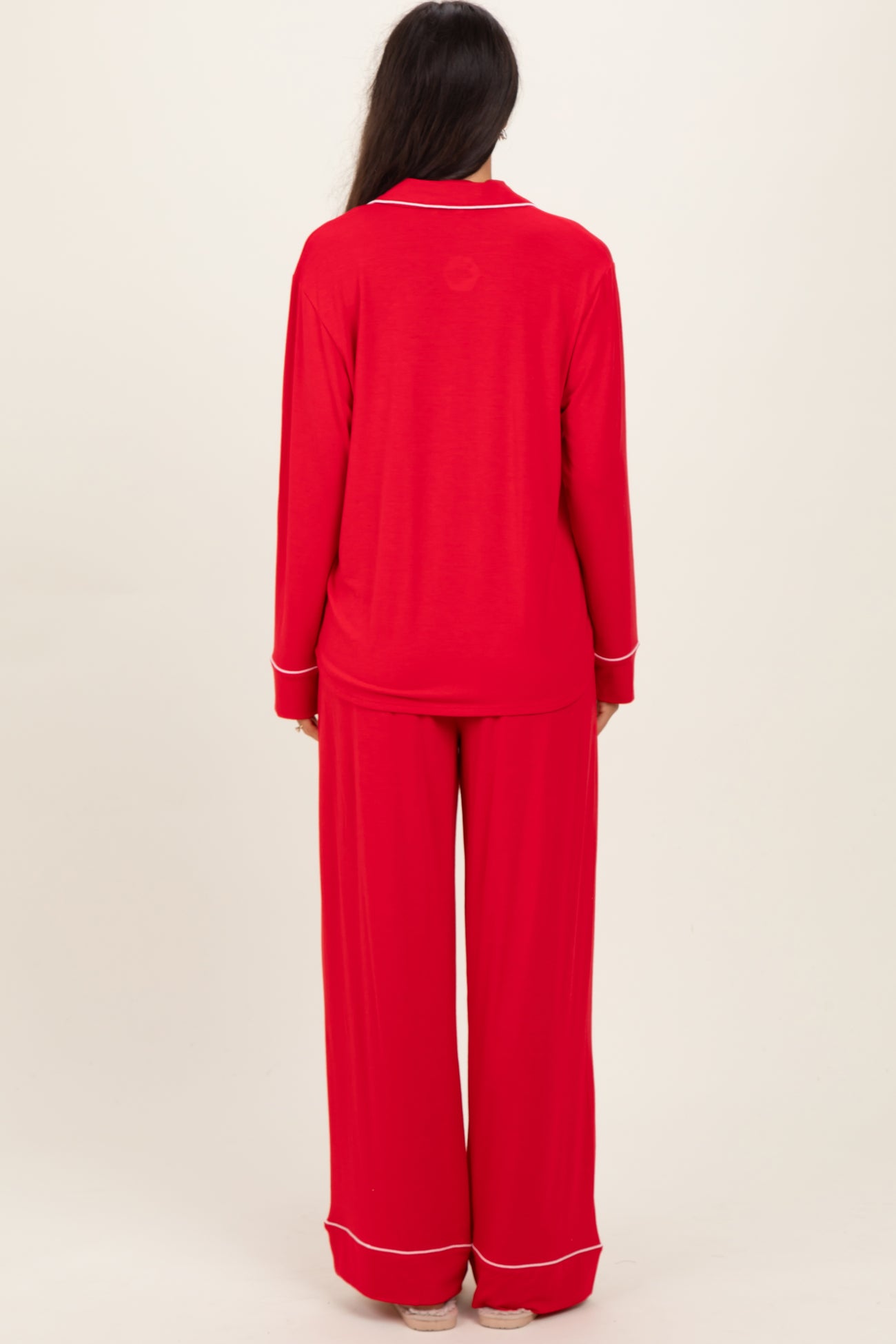 Upgrade your loungewear with this Red Button Down Top and Wide Leg Pant Pajama Set. Crafted for ultimate comfort, the soft fabric feels gentle against your skin, perfect for relaxing or sleeping. The classic button-down top features a chest pocket and elegant white piping detail for a timeless look. The wide leg pants offer a relaxed fit, easy movement, and a cozy elastic waistband. This vibrant red set combines style and comfort effortlessly, making it a must-have addition to your sleepwear collection. Ideal for cozy nights in or casual mornings. Available in multiple sizes for the perfect fit.