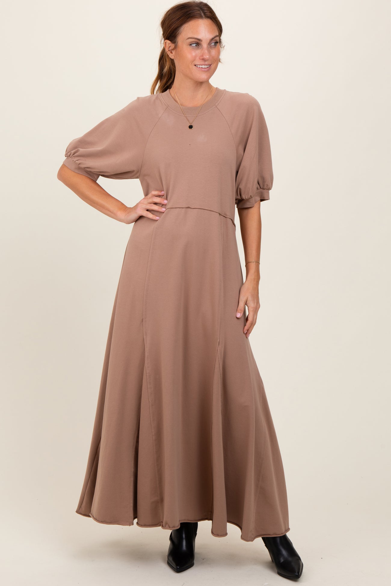 Taupe Puff Sleeve Basic Midi Dress