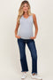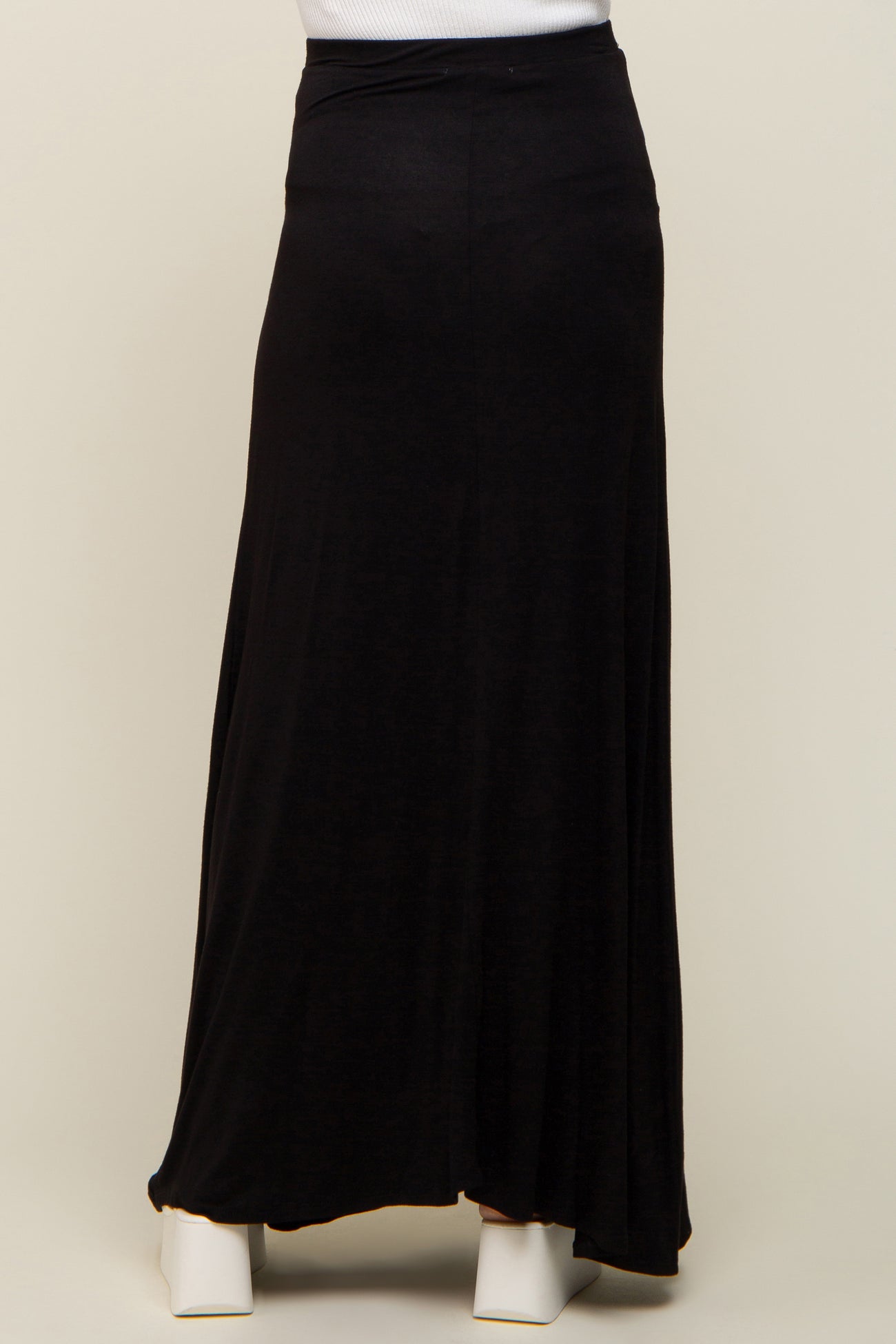 A solid, soft knit maternity maxi skirt with an elastic waistband and a front tie accent.