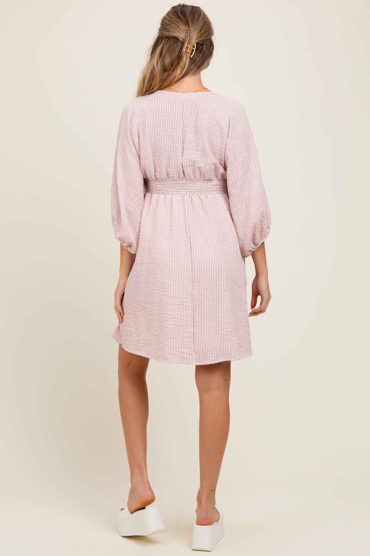 Embrace comfort and style with our Mauve Striped Balloon Sleeve V-Neck Maternity Dress. Designed to flatter your growing bump, this dress features soft mauve and white stripes for a fresh, chic look. The deep V-neckline adds a touch of elegance, while the balloon sleeves create a trendy, relaxed silhouette. Made from lightweight, breathable fabric, it's perfect for all-day wear, whether you're out for a casual stroll or attending a special event. The empire waist gently hugs your bump, providing both comfort and support. Effortless style for every mom-to-be!