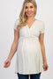 A multi-color floral maternity maxi dress featuring short sleeves, side ruching, a side slit and a rounded neckline.