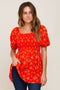 Details A printed maxi dress that featured short puff sleeves, a smocked top, a squared neckline, and a tiered skirt. Content + Care