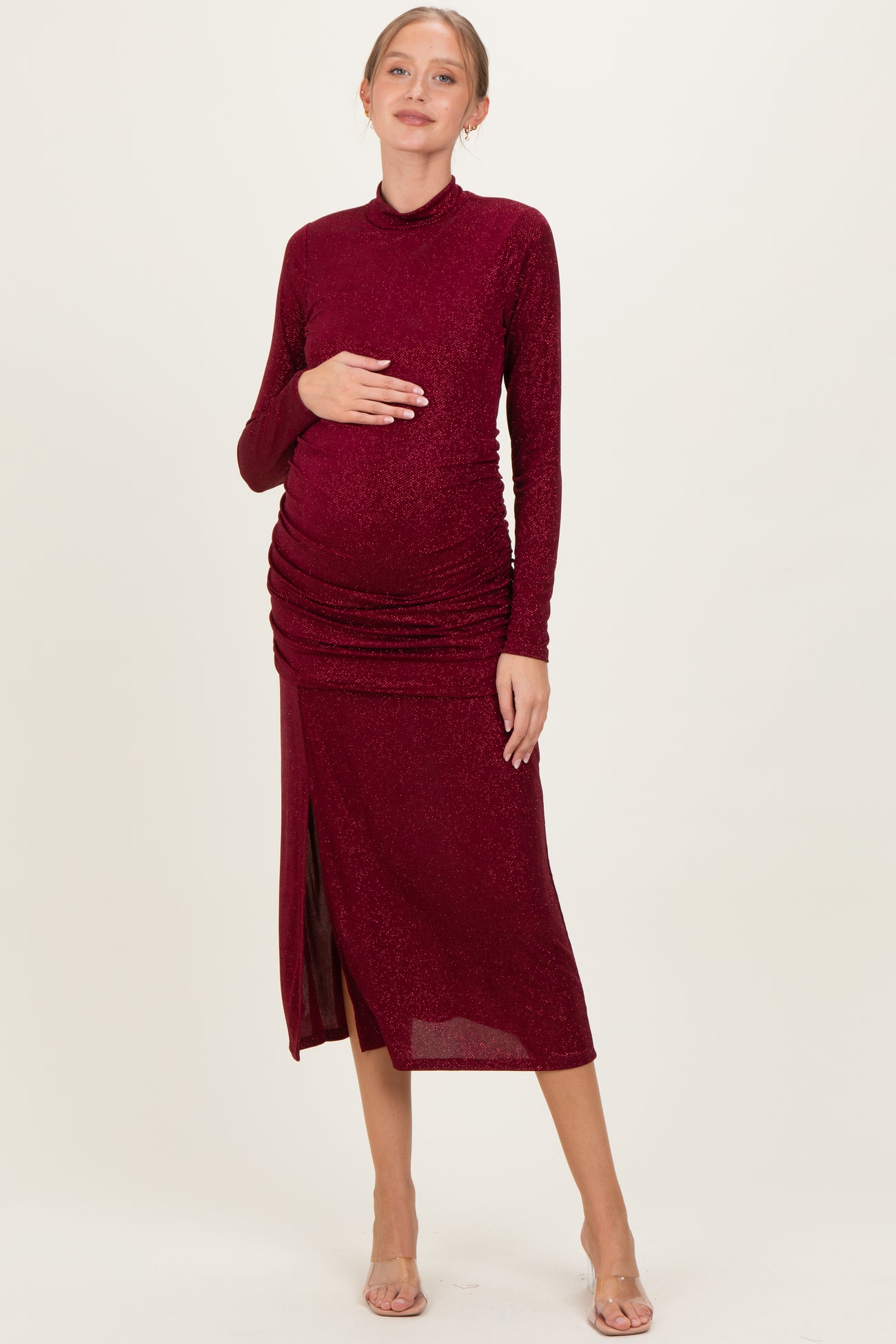 Burgundy Sequin Long Sleeve Mock Neck Maternity Maxi Dress
