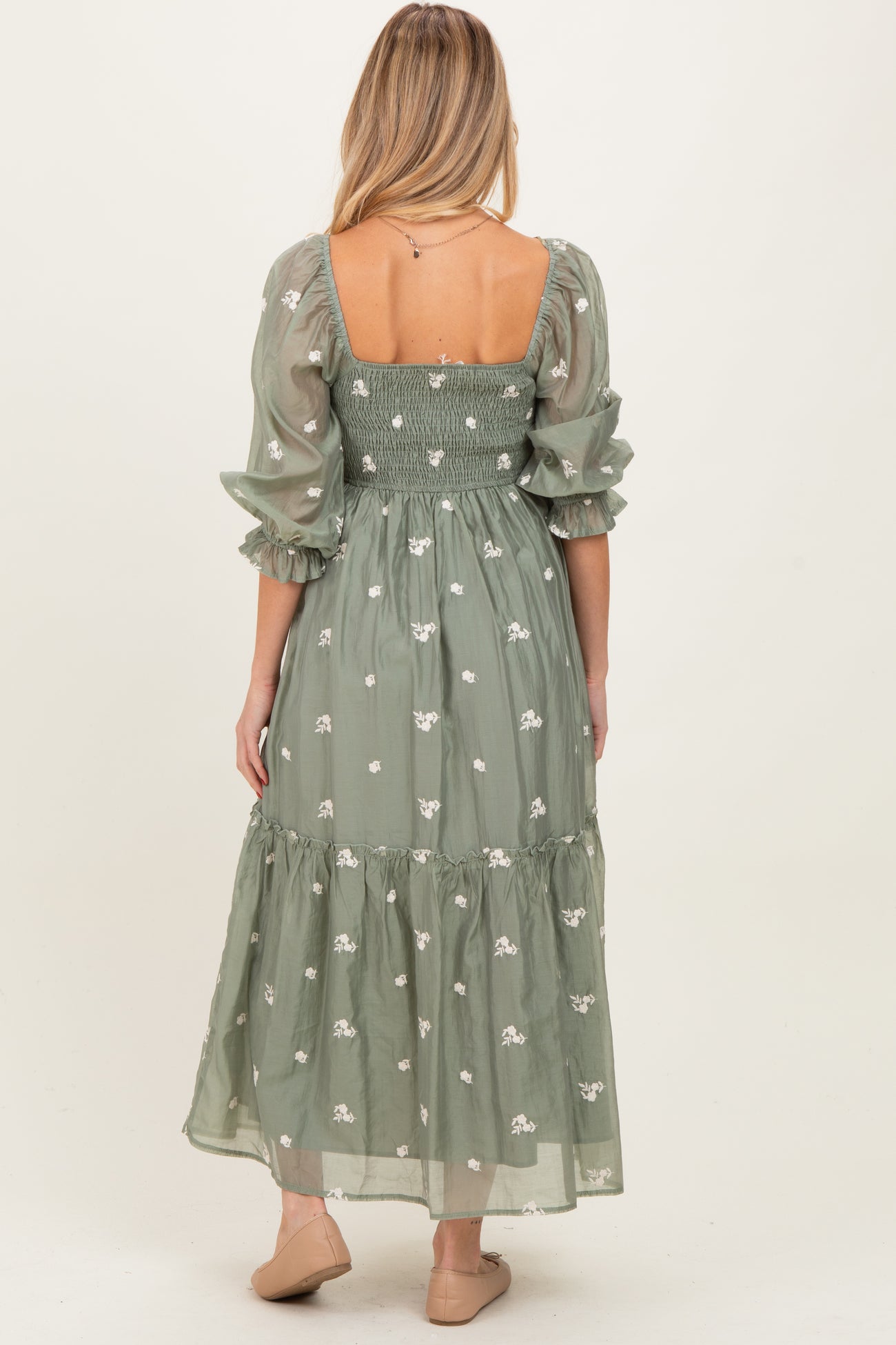 Light Olive Floral Embroidered Smocked 3/4 Sleeve Maternity Midi Dress