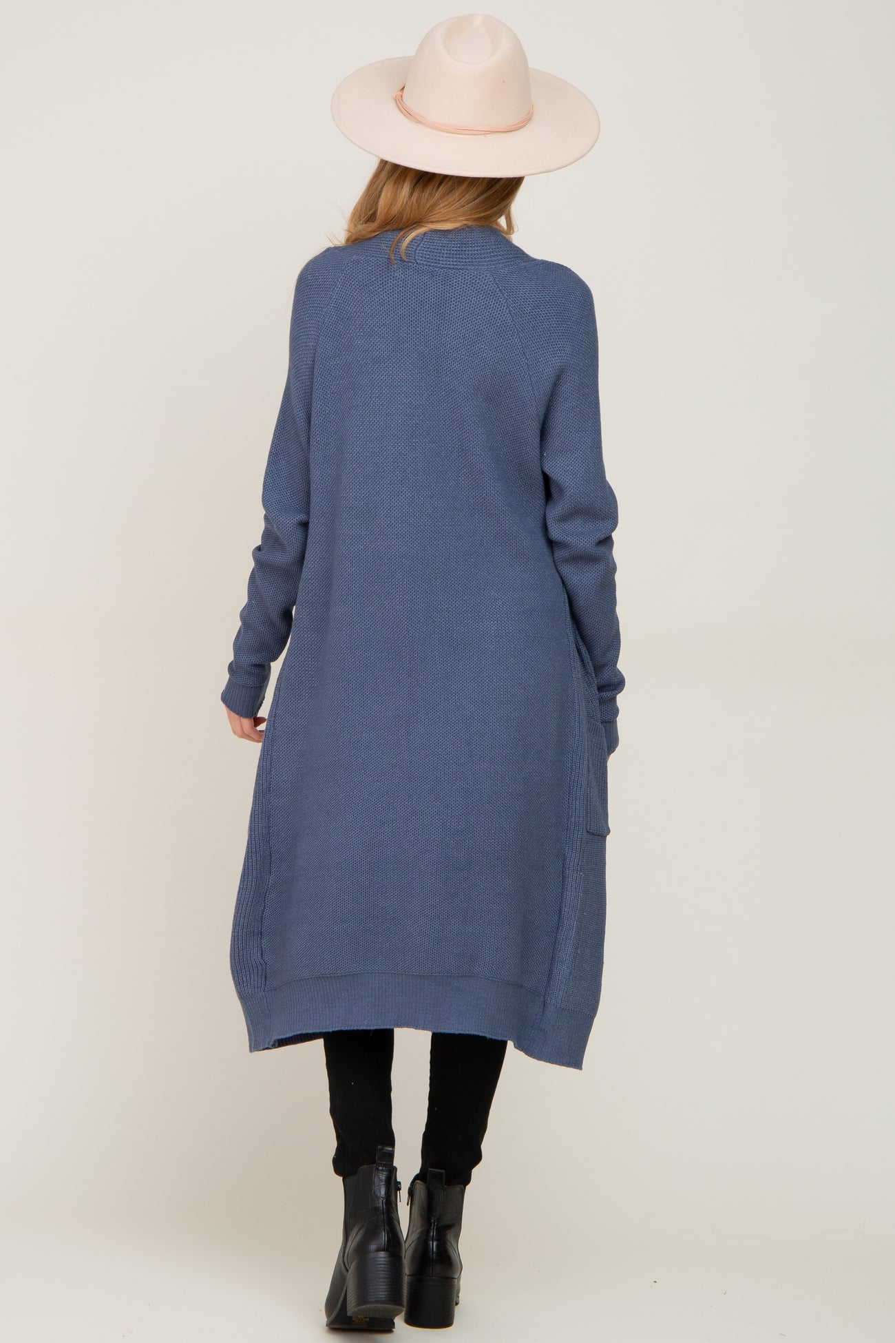 A solid maternity cardigan with an open front and two front pockets in a long length style.