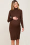 A solid hued maternity dress featuring long sleeves and a square neckline.