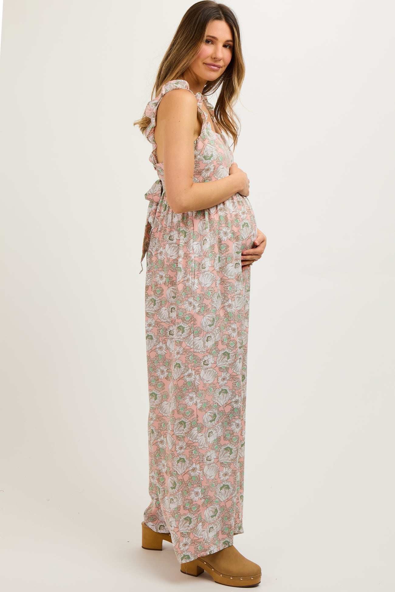 A floral maternity jumpsuit with a squared neckline, adjustable ruffle accent straps, a back tie, side pockets, and wide leg pants.