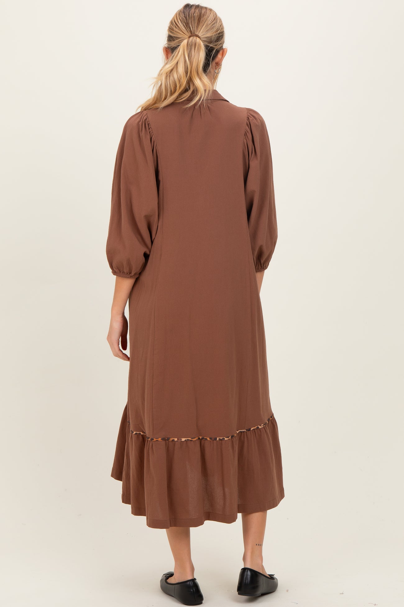 Elevate your maternity wardrobe with this Brown V-Neck Contrast Trim 3/4 Sleeve Maternity Midi Dress. Crafted for comfort and style, this dress features a flattering V-neck with delicate contrast trim detailing that adds a chic touch. The smocked bodice gently stretches to accommodate your growing belly, while the 3/4 puff sleeves provide just the right amount of coverage and elegance. Made from soft, breathable fabric, it offers all-day comfort and breathability. The midi length and flowy silhouette make it perfect for any occasion—whether casual outings or special events. Pair with flats or heels to complete your look effortlessly.