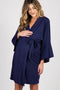 A solid maternity robe with crochet trim and open front with tie closure.