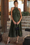 A solid hued maternity dress featuring long sleeves and a square neckline.