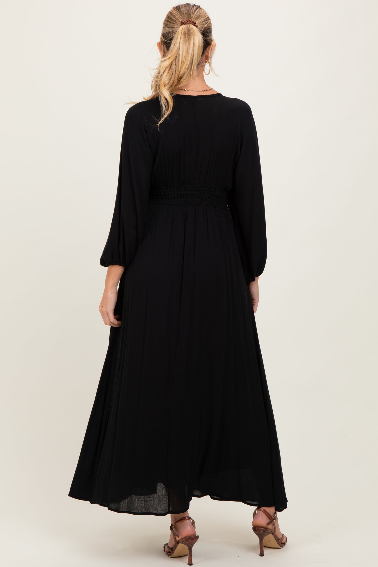 Black Solid Long Sleeve V-Neck Smocked Detail Maternity Maxi Dress