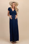 A solid, sleeveless, chiffon maternity dress featuring a high neckline with ruffle trim collar, a tie in the back, and double lining to prevent sheerness.
