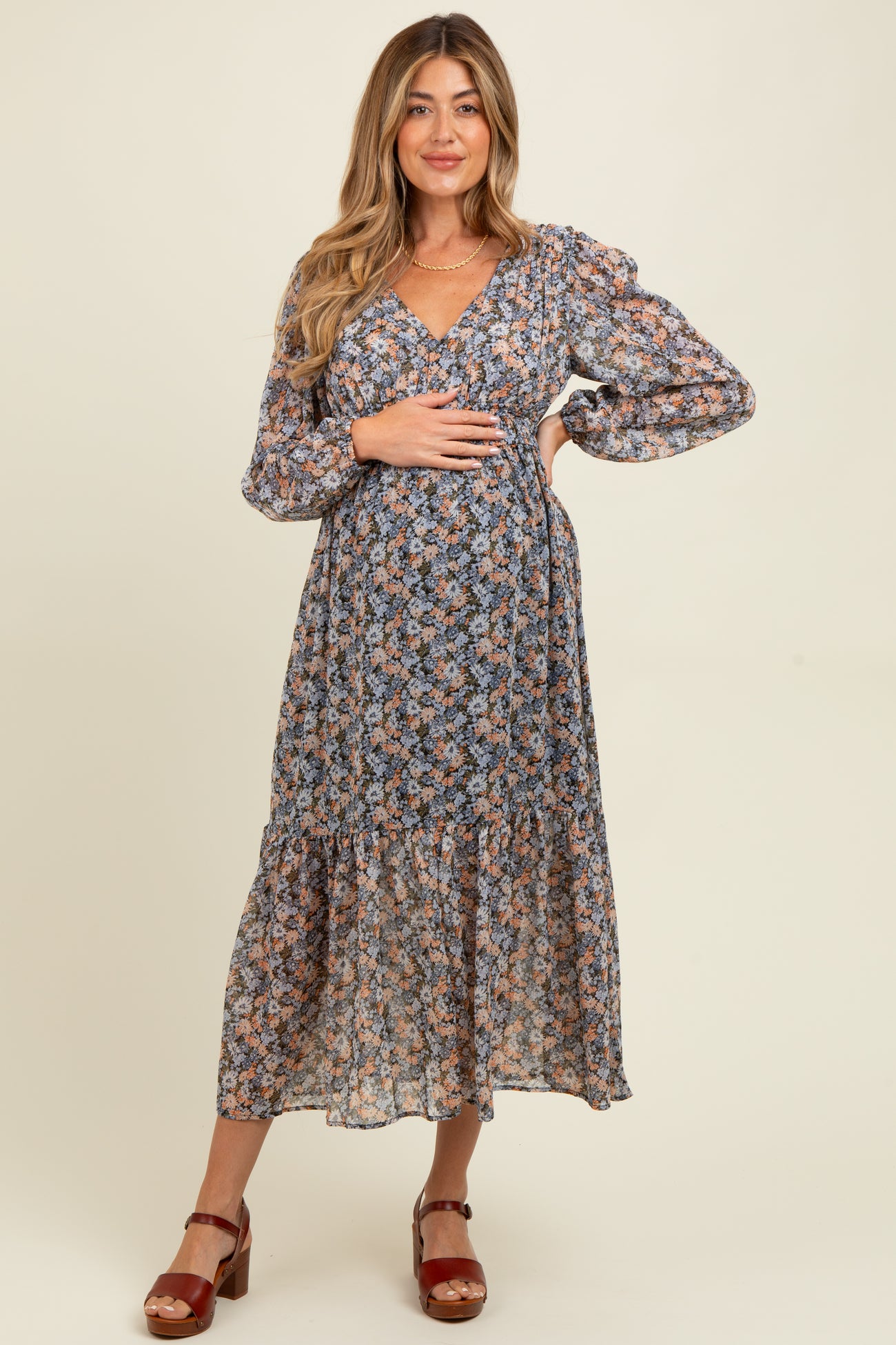 Blue Floral Smocked Waist Maternity Maxi Dress