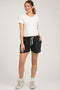 A solid pair of maternity shorts with an elastic waistband with drawstring, raw hem accents and hem. Pocketed.