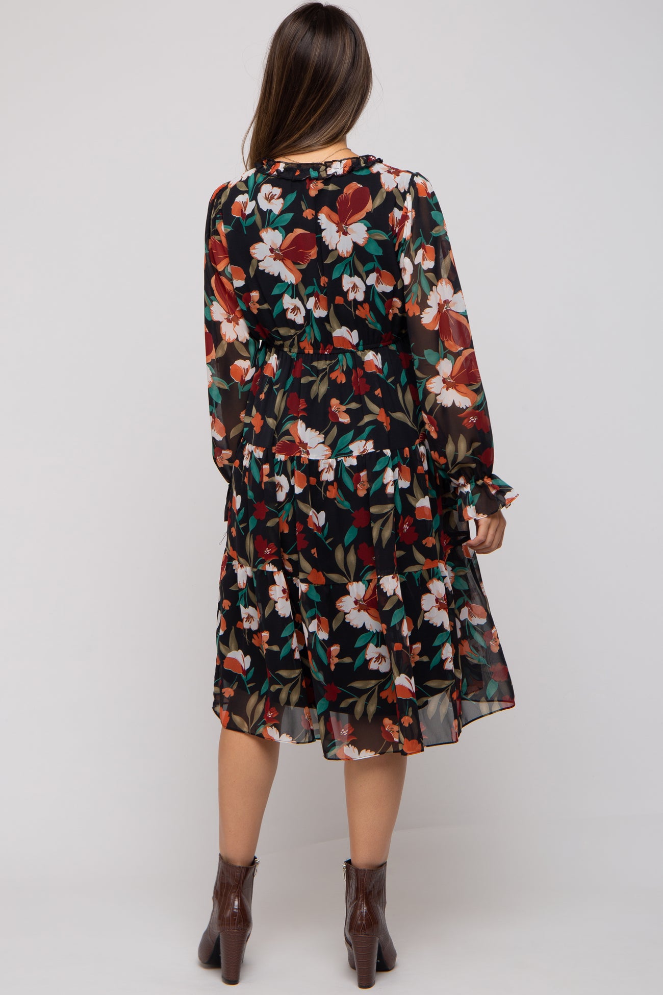 A floral chiffon maternity dress featuring a v-neckline with ruffle trim, long sleeves, a tiered skirt and double lining.