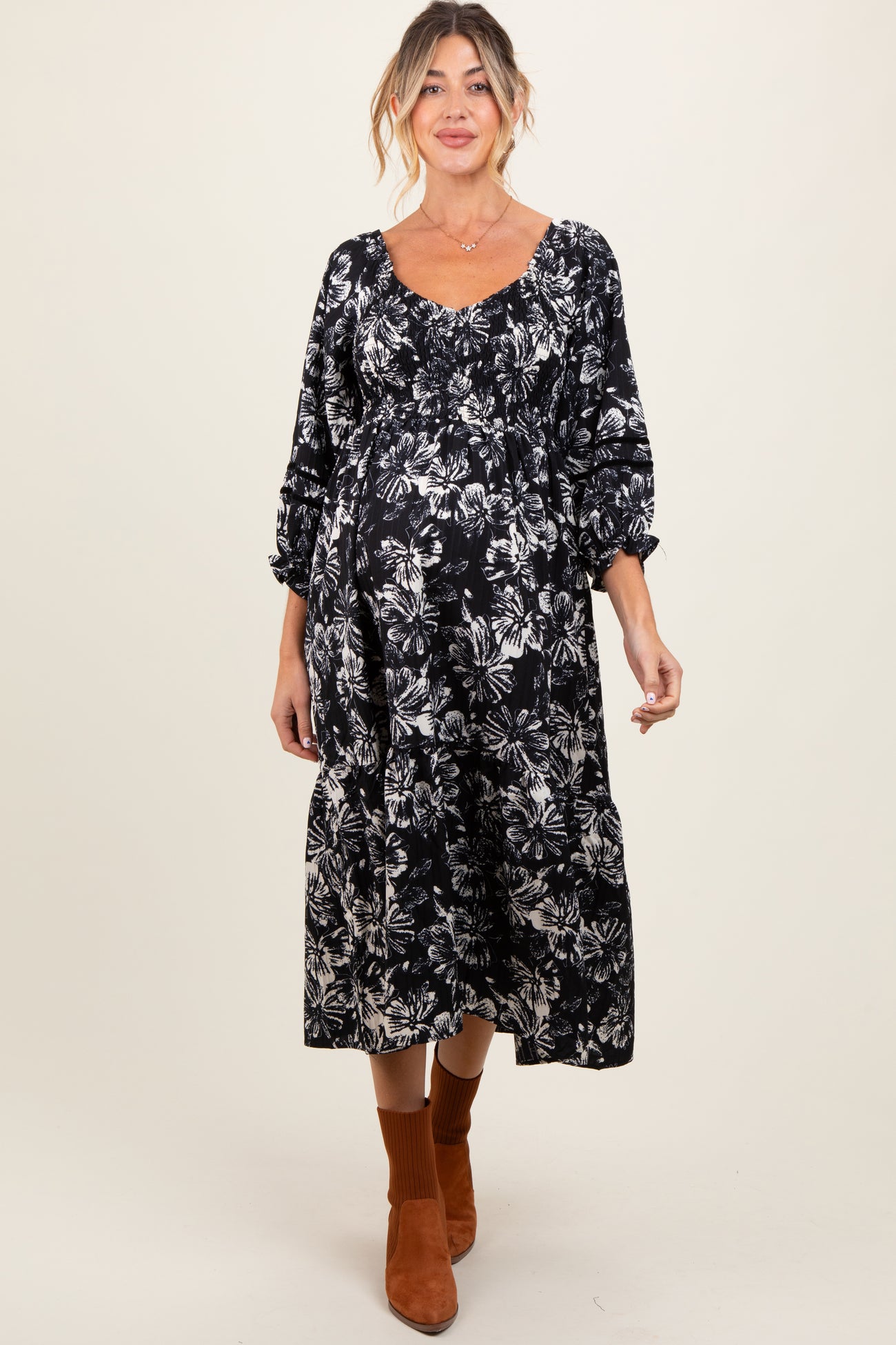 Black Floral Smocked 3/4 Sleeve Tiered Maternity Midi Dress