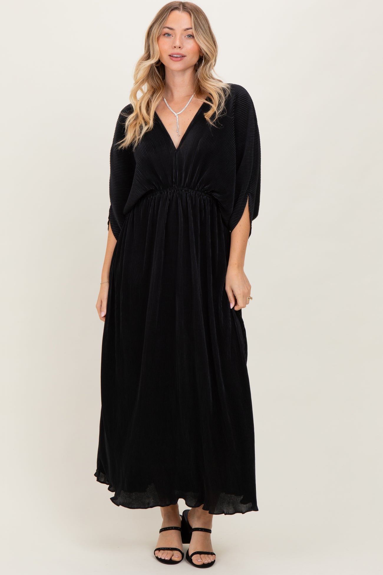 Black Pleated Satin Dolman Sleeve Maternity Maxi Dress