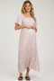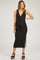 A sleeveless, rib knit maternity midi dress with a wrap v-neckline, a side tie at the waist, and a side slit.