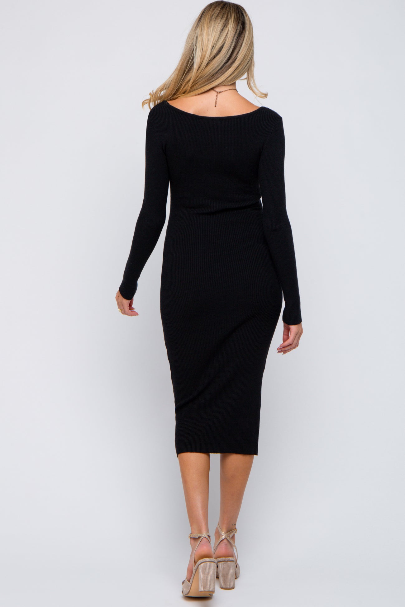 A rib knit maternity midi dress featuring a scoop neckline and long sleeves.