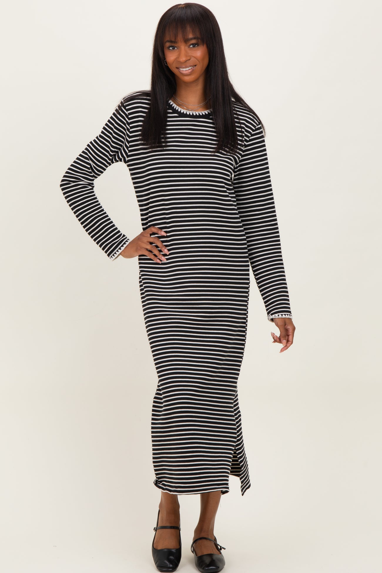 Black Striped Stitch Detail Long Sleeve Maternity Midi Dress