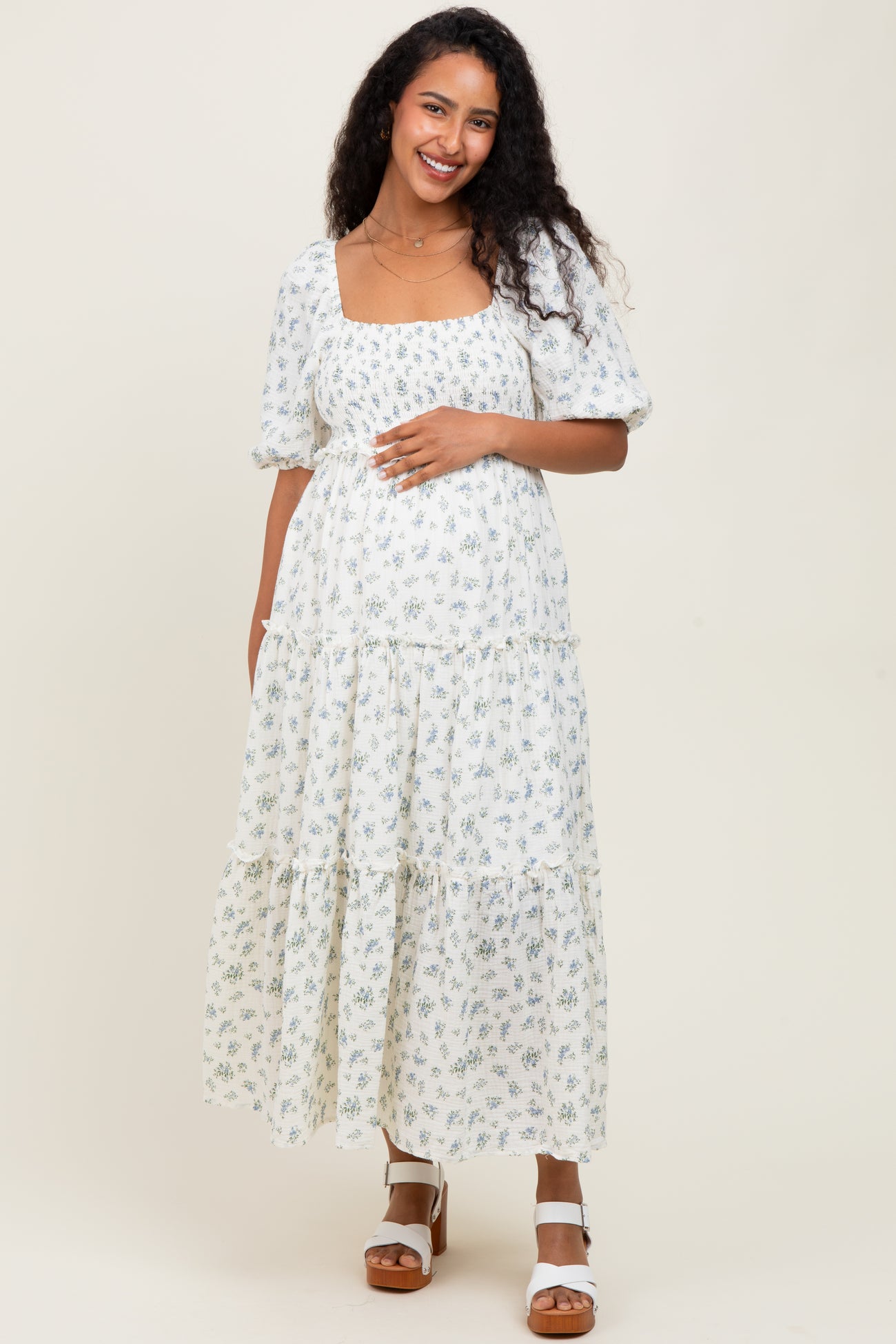 Blue Floral Smocked Ruffle Tiered Maternity Maxi Dress